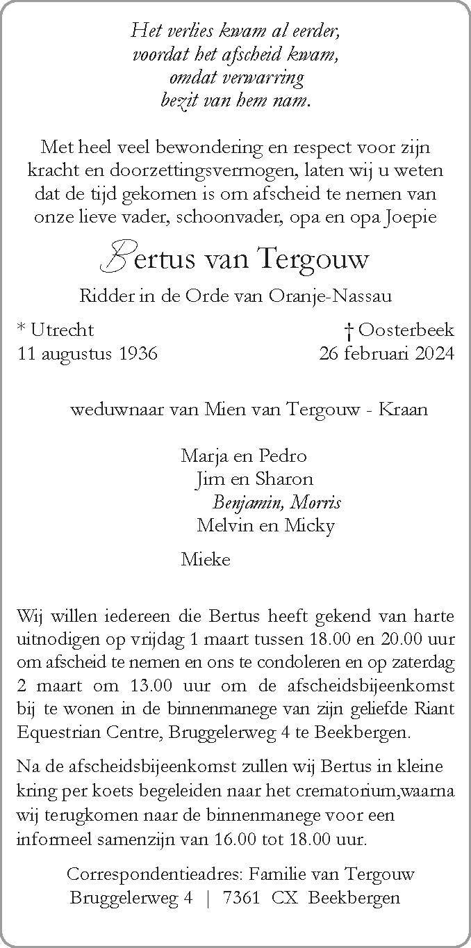 Bertus van Tergouw overleden
