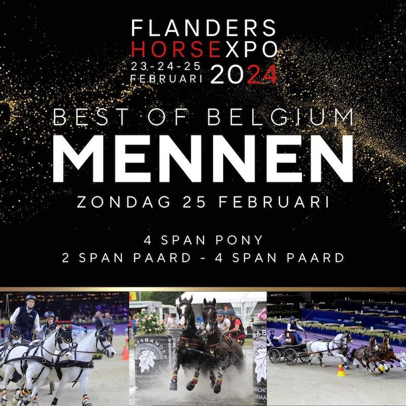 De "Best of Belgium: Mennen" het men-evenement dat op 25 februari in de hoofdpiste op Flanders Horse Expo in Gent verreden werd, was een ongeëvenaard succes met een indrukwekkend deelnemersveld van het hoogste niveau. Het aanwezige publiek juichte de topatleten met groot enthousiasme toe.Het evenement trok niet alleen de aandacht van liefhebbers van de vierspan-mensport, maar ook van een breder publiek dat genoot van de sfeervolle ambiance waarbij de muziek verzorgd werd door een professionele DJ.