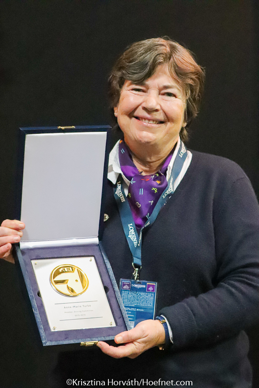 Tijdens de Wereldbekerfinale in Bordeaux ontving het Franse jurylid Anne Marie Turbé uit handen van FEI Driving Director Manuel Bandeira de Mello een medaille als dank voor haar lidmaatschap van de FEI Driving Committee dat afgelopen november werd beëindigd.