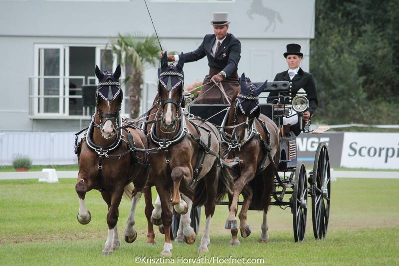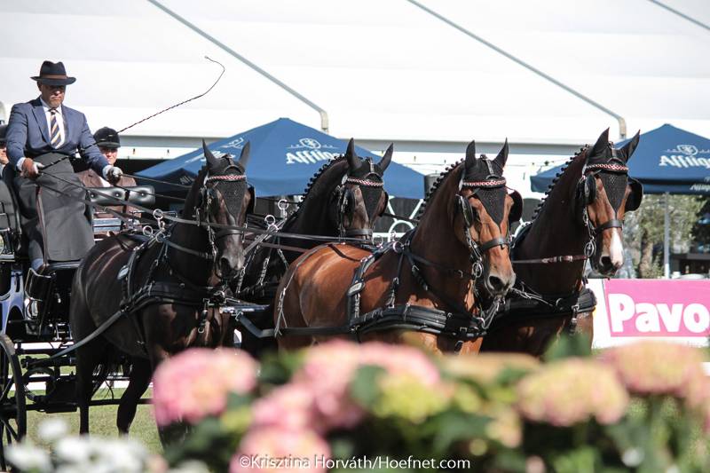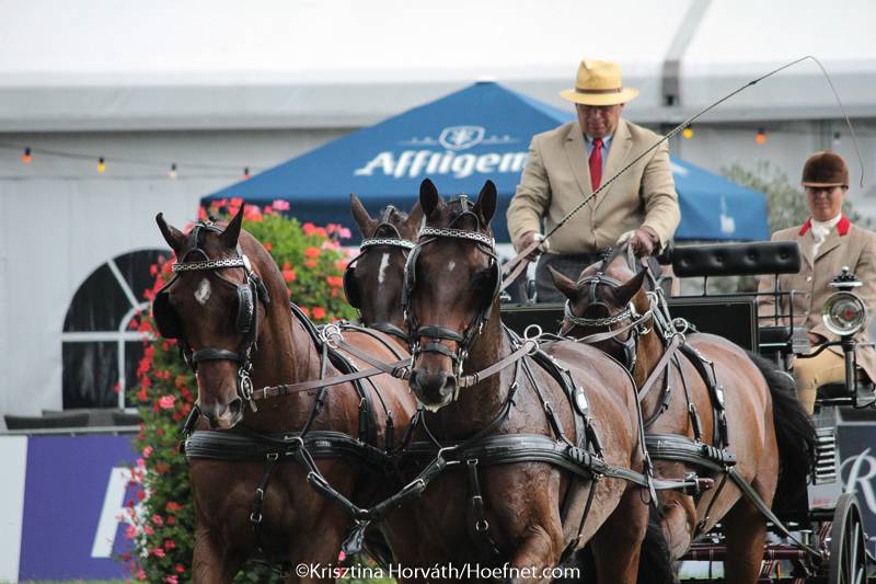 After four-times World Champion and Dutch team member IJsbrand Chardon had taken the lead in the provisional dressage standings the first day, all eyes were set on the reigning World Champion Boyd Exell this morning. Boyd had decided to use the experienced 16-year old gelding Rambo in the wheel instead of the better moving mare Daphne. Boyd showed perfect tempo changes, transitions and extensions with his beautiful team of horses and was awarded with the winning score of 33,15 points by the Ground Jury: “I was very pleased with my test, the horses went very well. I am disappointed that the Judges were not brave enough to give points,” commented Boyd. “I believe I have the best pair of leaders that there are at the moment. I have sold one of them to Hungarian driver Martin Hölle, who will use this horse in his horse pair. I thought to myself that if I can’t get more points anyway with these two fantastic leaders, I might as well sell one. I do have a lot of depth in my team, I will use the leader horses of Aachen in my team next season.”