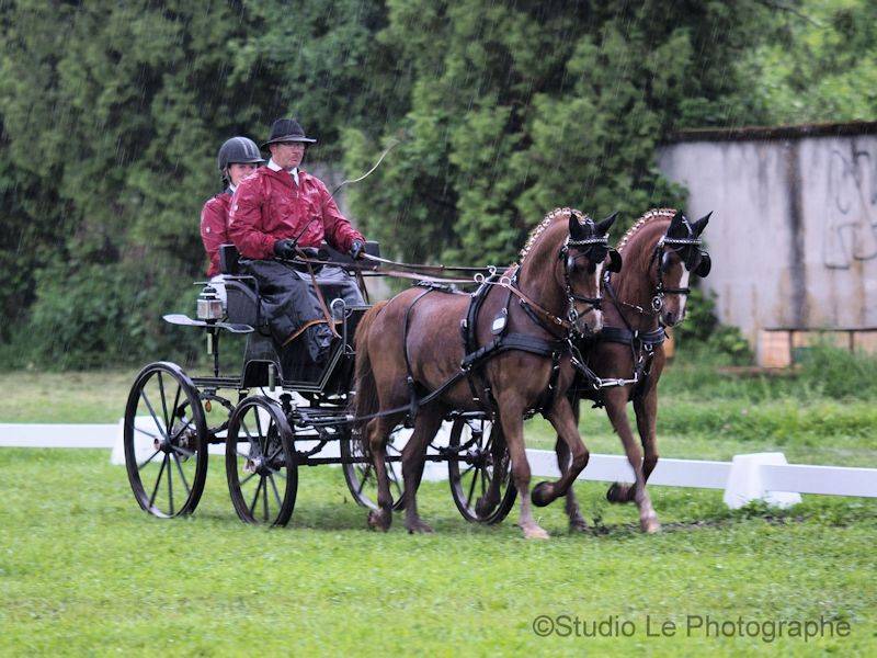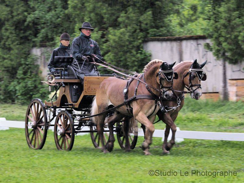 Bei den Zweispännern konnte Jan-Felix Pfeffer (GER) die Führung halten und die Dressur gewinnen. Auf den zweiten Platz fuhr heute Dieter Baackmann (GER) mit 44.29 was knapp zwei Punkte Rückstand bedeutete. Auch gut mit dem strömenden Regen zurechtkam der Südtiroler Johann Weitlaner, der mit seinen Haflingern 45.76 totalisierte vor Max Berlage (GER) mit 46.40 Punkten.