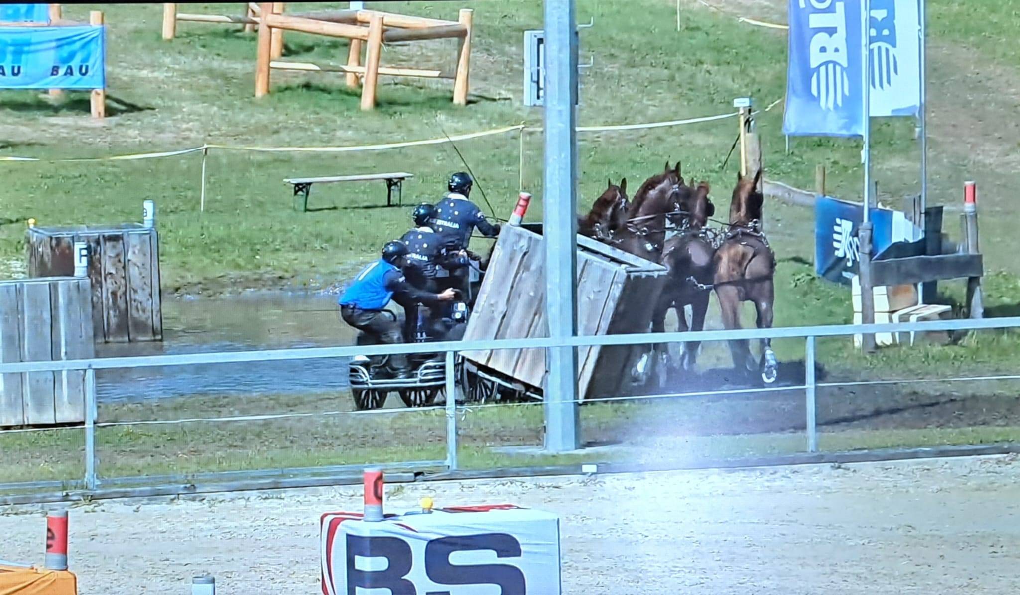József Dobrovitz Jr, Boyd Exell en Glenn Geerts leken nergens last van te hebben. József zette in drie hindernissen de beste tijd neer, Boyd in de andere drie. De Australiër, voor deze wedstrijd met KWPN – vossen rijdend (én een andere navigator: Catharina Matschurat, de groom van zijn landgenoot Tor Van Den Berge) liet enkele balletjes rollen in het parcours. Ook in de voorlaatste hindernis maakte hij het nog even spannend voor het publiek door ‘Banden-kontakt mit seiner Kutsche’ te hebben met poort F, zoals de commentator mooi zei, waardoor de koets schoof en de kubus bijna in zijn geheel ondersteboven ging. Het liep allemaal goed af.