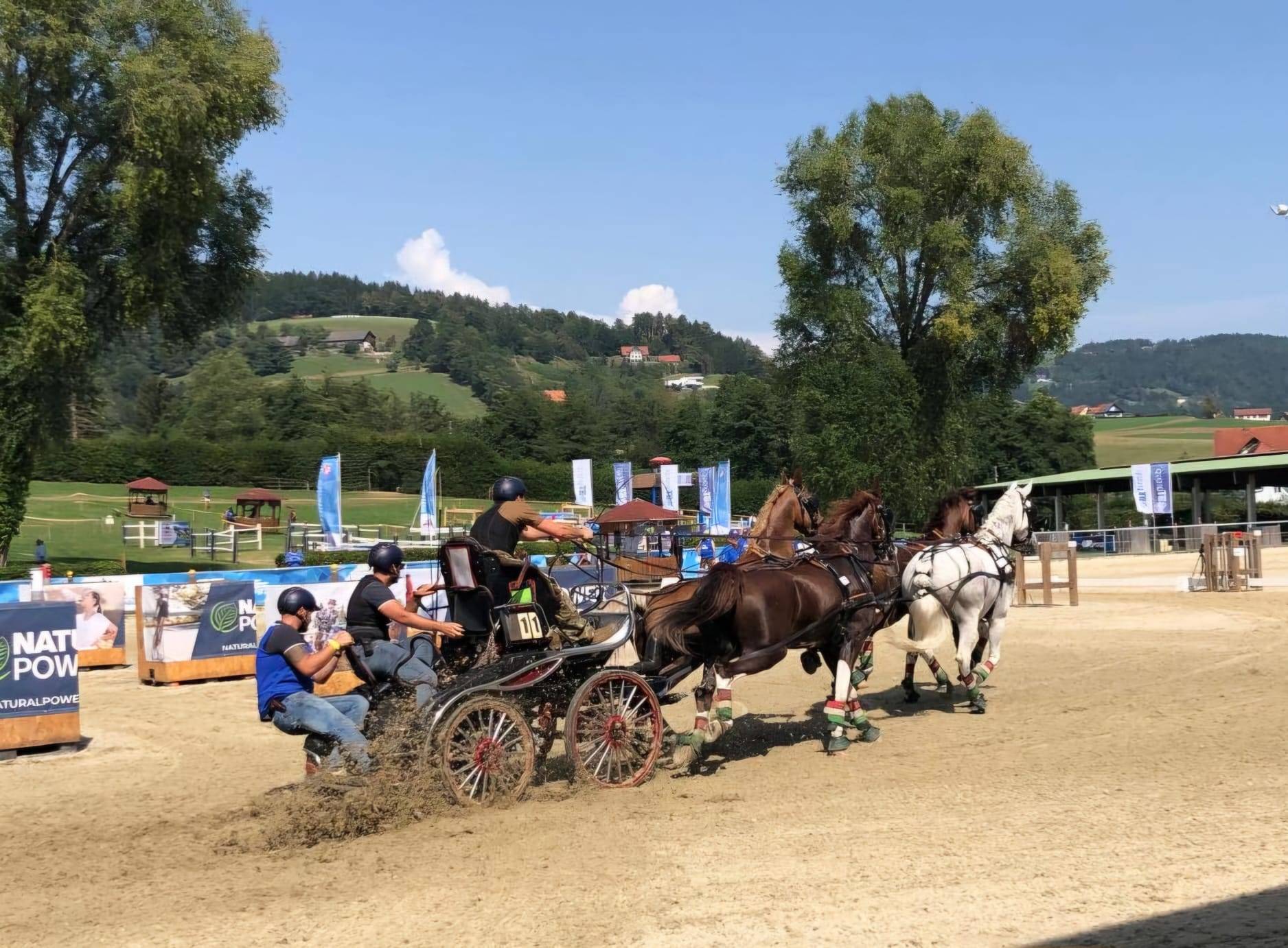 De wedstrijd begon met de nationale wedstrijd voor tweespannen. Eén span werd geëlimineerd: in hindernis 3 wipte de marathonwagen aan één kant op waardoor de menner uit de bokstoel kukelde. Hij zat er echter razendsnel weer op, dus alles liep goed af.