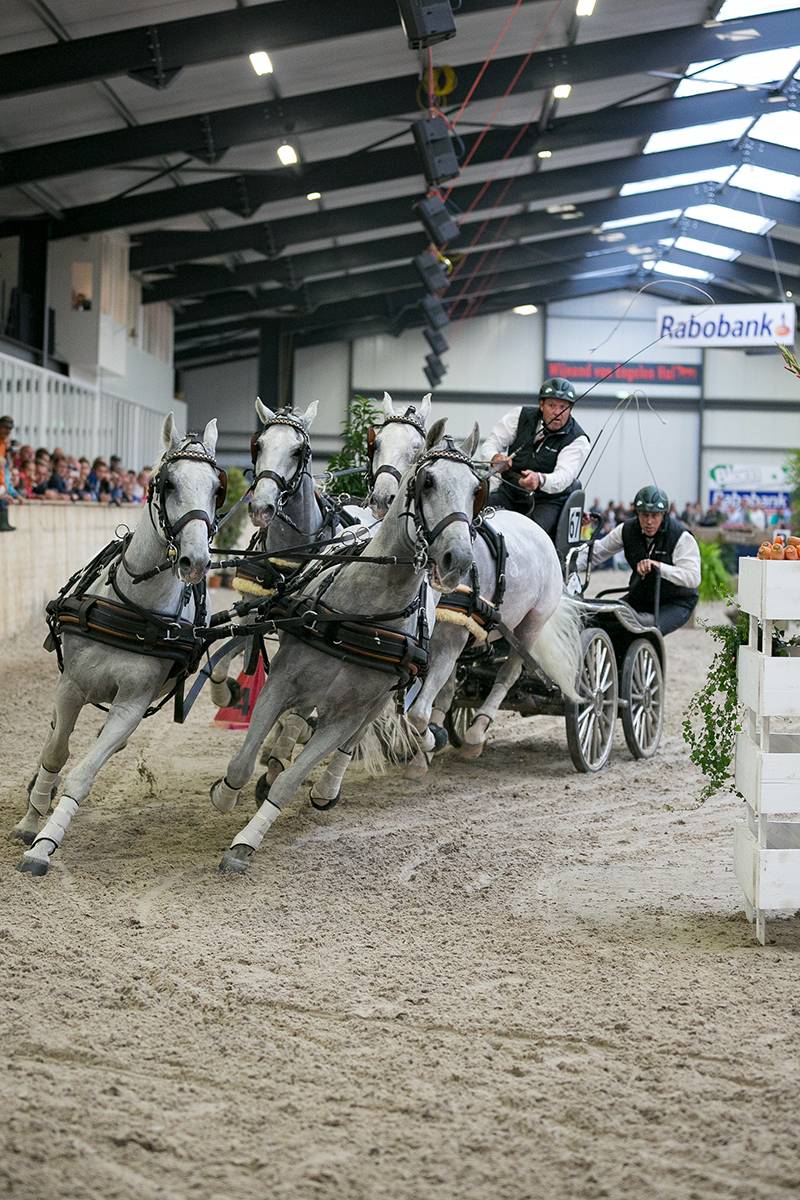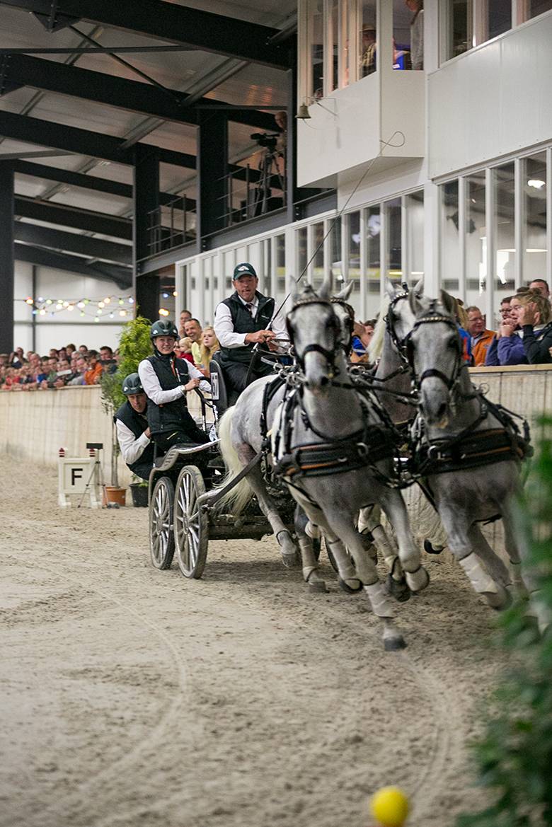 Bij de vierspannen drongen Theo Timmerman, IJsbrand Chardon en de Duitser Daniel Schneiders door tot de finale. Timmerman ging als eerste voortvarend van start, nam alle risico en reed er daardoor twee balletjes af. Chardon, die in de eerste manche nog fikse problemen op de brughindernis kende door de onwennigheid van een nieuw voorpaard in zijn schimmelspan, stelde in de finale orde op zaken. De paarden accelereerden fantastisch, de brug was geen probleem meer en alle ballen bleven liggen. Daniel Schneiders wist wat hem te doen stond, maar kon de snelheid van Chardon niet evenaren en moest tot overmaat van ramp in hindernis 9 een extra bochtje draaien. De grote piste van de Voornruiters bood de vierspantoppers een mooie opwarmoefening naar de eerste wereldbekerwedstrijd. Het publiek genoot met volle teugen, zeker toen de drie finalisten na hun ereronde spontaan een spectaculair showtje weggaven.