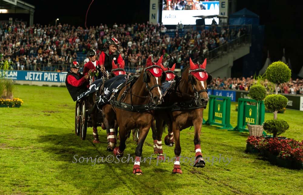 Der schweizerische Vierspännerfahrer Jérôme Voutaz bildete gestern Abend mit seinem Landsmann Pius Schwizer und der Spitzen-Vielseitigkeitsreiterin Ingrid Klimke (Münster) das siegreiche Team beim spektakulären Jump & Drive Show-Wettbewerb in der mit tausenden Zuschauern gefüllten Aachener Soers. Das Team von Glenn Geerts wurde Zweiter, während Boyd Exell und sein Team den dritten Rang belegten.