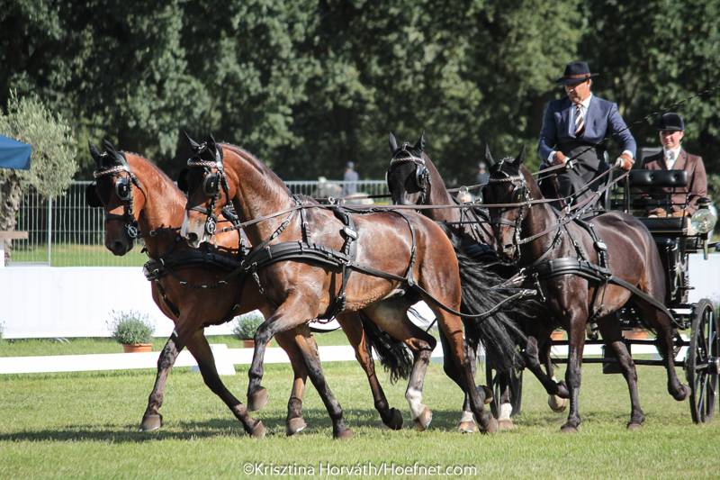 Chardon fuhr eine schöne und entspannte Aufgabe, die sich durch eine sehr gute Versammlung und perfekte Übergänge auszeichnete. Die fünf Mitglieder der internationalen Jury sahen Chardon einhellig an erster Stelle. Sein Landsmann Theo Timmerman liegt bislang an zweiter Stelle mit respektablem Rückstand, vor dem ungarischen Spitzenfahrer Zoltán Lázár, der heute als Letzter startete. Lisa Stroud aus den USA beeindruckte mit einer guten Vorstellung Ihres Viererzuges aus KWPN Fuchswallachen und belegt im Moment Rang vier. Mareike Harm stellte ihr Gespann ebenfalls gut vor und hat zurzeit den 5. Platz inne.