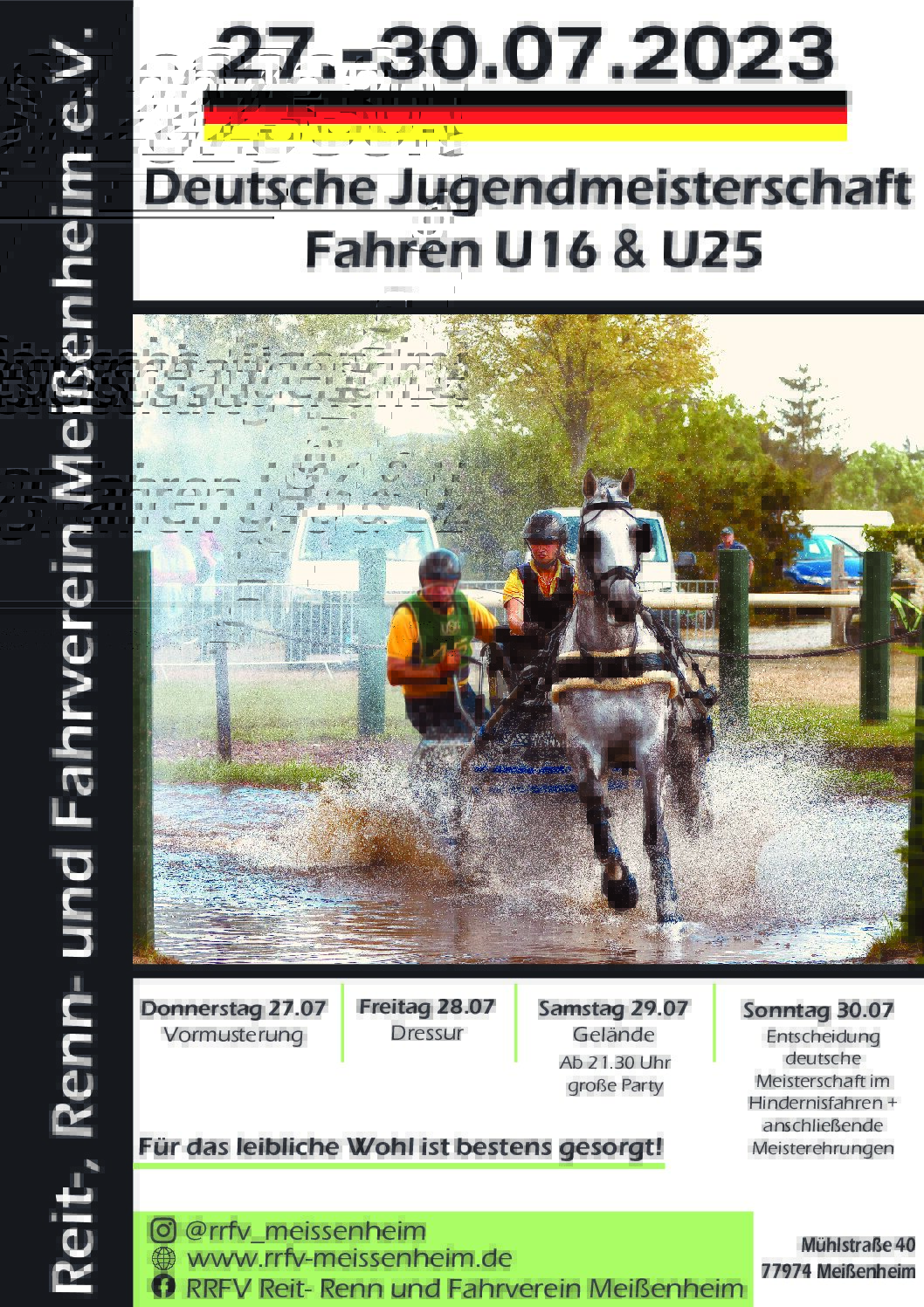 In Meißenheim in Baden-Württemberg sind an diesem Wochenende die Deutschen Jugendmeisterschaften im Fahren geendet. 103 Teilnehmer sind aus 13 Bundesländern in den Altersklassen U16 und U25 angetreten und haben ihre neuen Deutschen Meister ermittelt. „Das war wie immer eine tolle Veranstaltung mit vier ganz tollen Tagen und sehr gutem Sport“, so das Fazit vom Nachwuchs-Bundestrainer Dieter Lauterbach (Dillenburg).Der Veranstalter in Meißenheim hat viel Turnier-Erfahrungen, besonders auch im Fahrsport, denn dort wurden schon viele Sichtungen, Landes- und Deutsche Meisterschaften ausgerichtet. Aber eine Deutsche Jugendmeisterschaft, die es auch erst seit 2009 gibt, machte zum ersten Mal Station. „Die Bedingungen dort sind hervorragend, das Gelände ist super, aber auch die große Reithalle für das Catering und das Abendprogramm ist optimal“, sagte Lauterbach.
