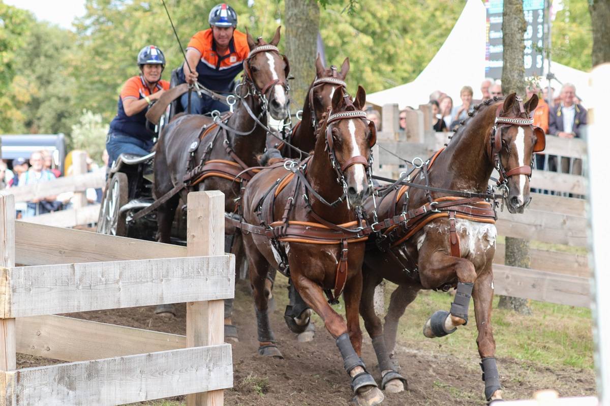 Koos de Ronde ist mit seiner heutigen Leistung sehr zufrieden. „Ich habe angegriffen, weil ich nach der Dressur ein paar Punkte holen wollte. Es war ein anspruchsvoller Marathon, und vor allem die Hindernisse 3 und 4 waren entscheidend. Meine Gespann lief top! In Hindernis 6 hatte ich einen unglücklichen Ball durch meine Vorderbracke, das hat mich den Sieg gekostet. Brauchle gibt natürlich auch immer Vollgas, also war es ein sehr schöner Kampf. Meine Pferde haben das super gemacht. In den Hindernissen 1 und 2 hatten wir die schnellste Zeit, dann hat Brauchle wieder aufgeholt und in Hindernis 7 hatte ich dann wieder die schnellste Zeit. Das war super cool und jetzt bin ich 3. in der Gesamtwertung. Das wird morgen sehr spannend.“ Koos wird morgen mit den gleichen Pferden wie heute in der gleichen Besetzung antreten. „Es war ein super Tag. Viele Zuschauer und ein richtig schöner Marathon, bei dem auch viel passiert ist. Und so sollte es bei einer Europameisterschaft auch sein, denn der Marathon muss ja entscheiden. Heute war ein Top-Tag für den Fahrsport und vor allem für mich.“