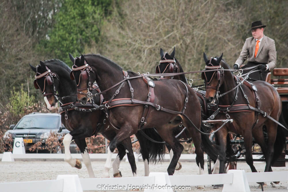 Bram Chardon startete die Hengste von Vilmos Jambor erstmalig und gewann die Dressur trotz eines Ungehorsams seines rechten Vorderpferdes Vulcano, der ausschlug. Harry Streutker wurde Zweiter.