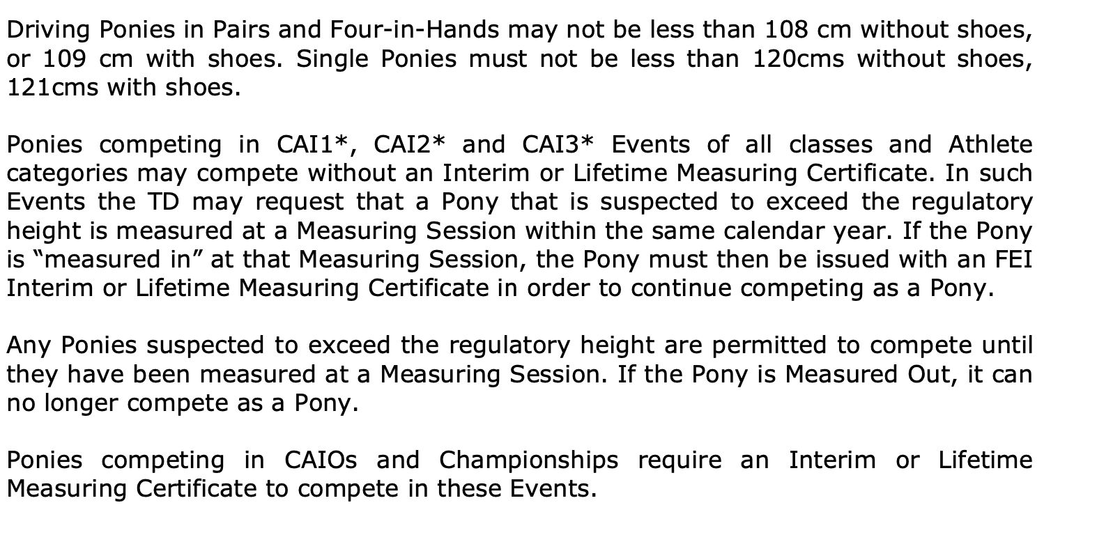 Die FEI hat einige Ausnahmen in das Reglement aufgenommen. Ab 1. Januar gilt, dass Ponys, die bei einer FEI-Ponymessung eingemessen werden und nicht größer als 140 cm ohne Hufeisen/141 cm mit Hufeisen sind und zwischen 6 und 8 Jahre alt sind, auch ein FEI Lifetime Measuring Certificate erhalten. Diese Ponys brauchen nur einmal eingemessen zu werden. Diese Regel gilt erst seit dem 1. Januar 2022, jedoch leider nicht rückwirkend. Für größere Ponys zwischen 6 und 8 Jahren ist die jährliche Messung demnach weiterhin verpflichtend.