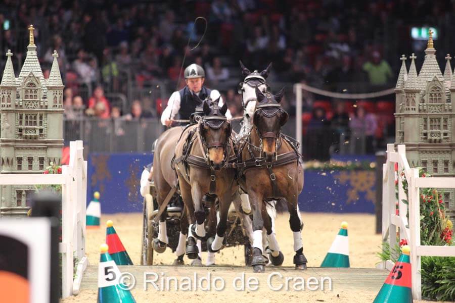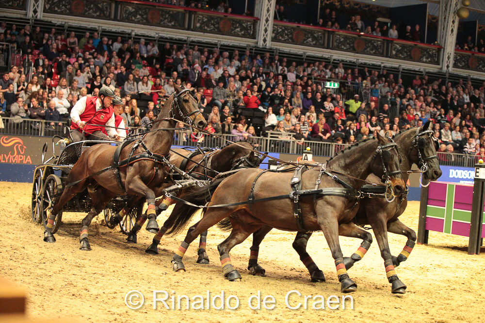 Heute Nachmittag stand die gemütliche Arena in London Olympia im Zeichen der Extreme Driving-Prüfung, bei der die Viererzüge bereits eine Kostprobe der Weltcupprüfungen bekamen, die am Freitag und Samstag auf dem Programm stehen. Boyd Exell gewann die Prüfung einmal mehr, vor József Dobrovitz und Koos de Ronde. Georg von Stein wurde Sechster.