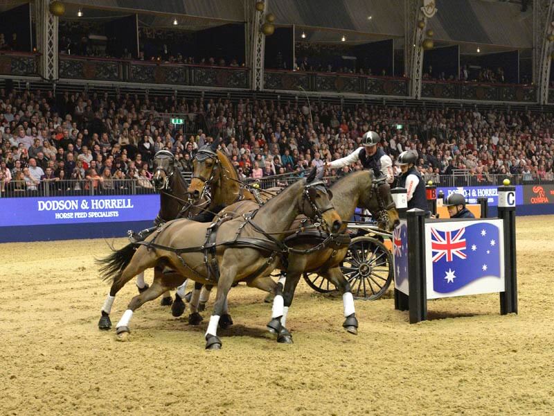 Boyd’s Viererzug war am Samstagabend voll in Schwung in der begeisternden Atmosphäre der London International Horse Show in Olympia: ”Ich qualifizierte mich für die Siegerrunde, in der ich als Letzter an den Start gehen durfte. Ich wusste, dass Dobrovitz und De Ronde jeweils Abwürfe eingefahren hatten, deshalb wollte ich primär zu Null fahren. Auf halbem Wege teilte mein hinterer Beifahrer mir mit, dass ich sechs Sekunden Vorsprung hatte, so dass ich im letzten Teil des Parcours keine Risiken mehr genommen habe.” Boyd kam mit zwei Sekunden Vorsprung vor Koos de Ronde ins Ziel, dank einer sehr klugen Wendung im ersten Marathonhindernis. Zum dritte Mal hat Boyd die FEI Weltcup-Prüfung Fahren in Olympia gewonnen, er gewann ebenfalls die Ausgaben von 2012 und 2014.