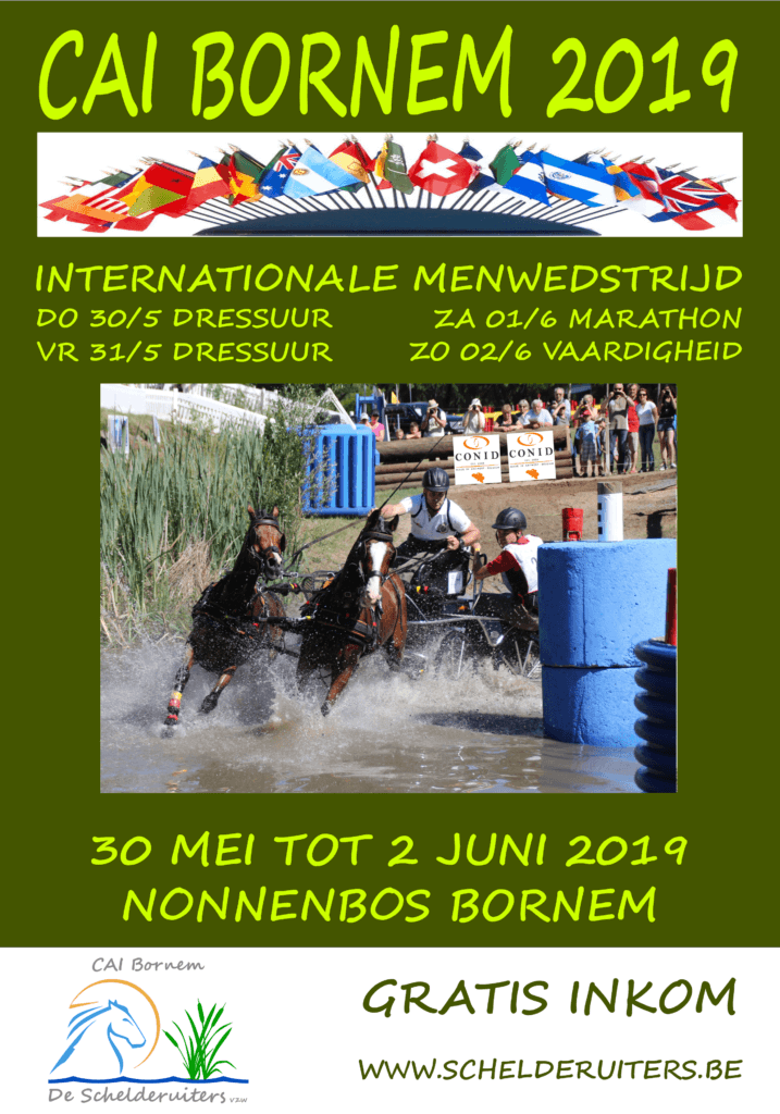 Belgien ist 2019 wieder mit einem internationalen Fahrturnier auf dem FEI-Kalender vertreten. Vom 30. Mai bis zum 2. Juni 2019 ist Bornem Austragungsort eines internationalen Zwei-Sterne-Turnieres für Ein-, Zwei- und Vierspänner Pferde und Ponys.Bornem richtet bereits seit Jahren ein schönes nationales Turnier aus und hat bereits mehrere belgische Meisterschaften organisiert. Darüber hinaus sind in Bornem mehrere WM-Medaillengewinner beheimatet.