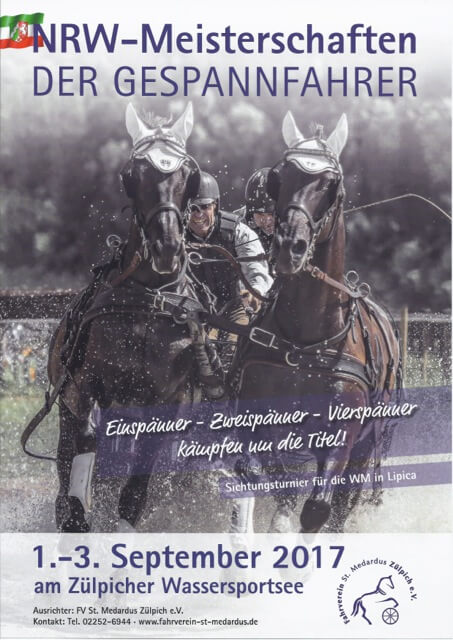 Vom 1. bis zum 3. September 2017 richtet der Fahrverein St. Medardus in Zülpich auf ihrer tollen Anlage die NRW-Fahrmeisterschaften der Ein-, Zwei- und Vierspänner Pferde und Ponys aus. In allen Anspannungsarten werden die NRW-Meister(innen) ermittelt und darüber hinaus gilt das Turnier als 4. Dichtung zur Weltmeisterschaft der Zweispänner Pferde Ende September im slowenischen Lipica.Programm