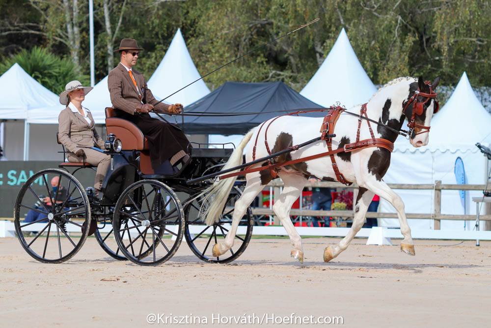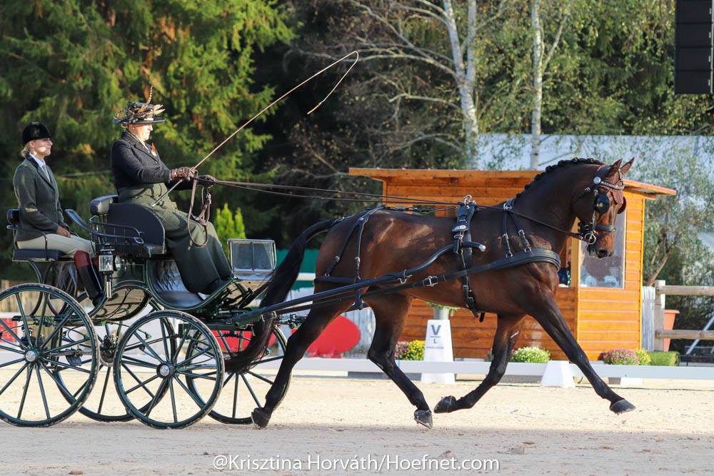 Am ersten Dressurtag der Einspänner-WM haben 36 Gespanne unter herrlichen Bedingungen ihre Aufgabe im Viereck absolviert. Insgesamt war das Niveau eher enttäuschend und die Richter waren deshalb, bis auf ein paar Ausnahmen, nicht gerade großzügig mit ihren Punkten. Kelly Houtappels (CAN) erreichte als Einzige ein Ergebnis unter 50 Strafpunkten. Fokko Straßner liegt mit 55,22 Strafpunkten vorläufig auf Platz vier.Die in den Niederlanden wohnhafte Fahrerin war gestern als eine der ersten Teilnehmerinnen an der Reihe. Ihr Pferd Flip stand toll an den Hilfen und tanzte durchs Viereck. Mit fließenden Übergängen und genau gefahrenen Bahnfiguren war das Gespann auf den Punkt in Bestform. Die Richter belohnten ihren Auftritt mit 45,89 Strafpunkten. ‘Ich bin sehr zufrieden,’ strahlte Kelly. ‘Es gab zwar noch einige Kleinigkeiten, aber insgesamt war es eine runde Sache und wir haben unsere beste Dressur bislang gefahren.’