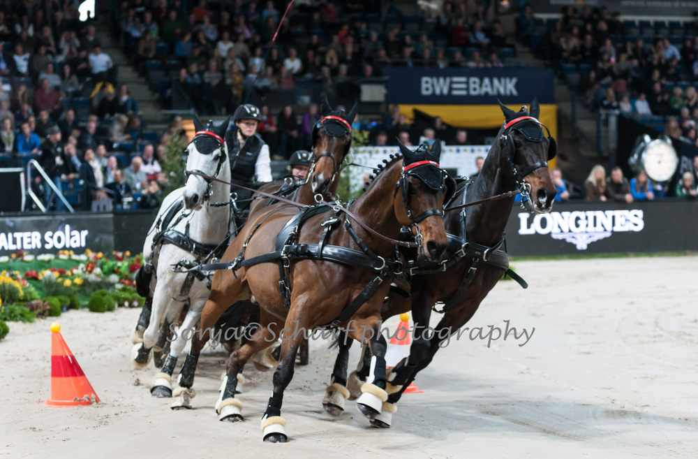 Schon vor einer Woche in Maastricht in den Niederlanden, der zweiten Weltcup-Station der Saison 2019/2020, machte sie mit ihrem vierten Platz darauf aufmerksam, dass sie nicht nur bei Outdoor-Turnieren ganz vorne mitfährt, sondern auch bei den spektakulären Indoor-Veranstaltungen mithalten kann. In Stuttgart unterstrich sie bereits in der Einlaufprüfung mit dem dritten Platz ihre gute Form, die sie mit einer strafpunktfreien Runde und Platz drei im Umlauf in der für die Weltcup-Punkte entscheidenden Prüfung am Samstag bestätigte. „Mein Plan war einfach, eine ruhige und fehlerfreie erste Runde zu fahren, um dann im zweiten Umlauf mehr Risiko zu gehen. Das hat super geklappt. Die Pferde waren richtig gut drauf und haben toll mitgemacht. Ich habe in der Abreitehalle gesehen, wie stark die Gespanne vor mir gefahren sind und habe gar nicht mehr daran geglaubt, dass ich es ins Stechen schaffe“.