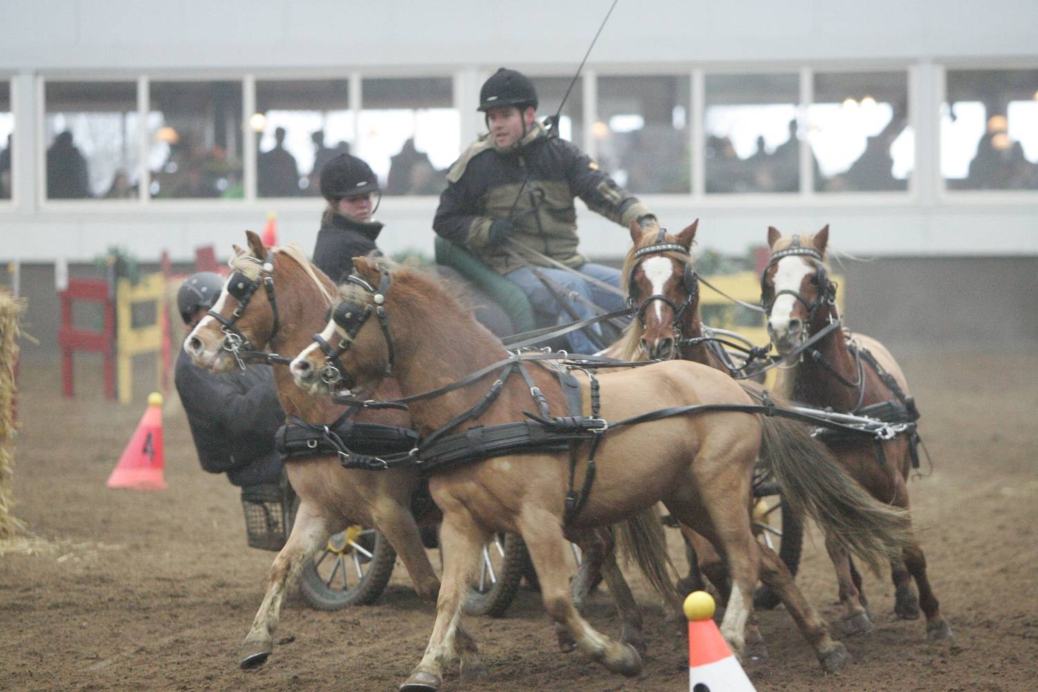 Afgelopen weekend werd bij Stal De Ronde in Zwartewaal het districtskampioenschap West verreden. De minimarathon trok ruim 60 deelnemers waarvan uiteindelijk zes menners zich kampioen mogen noemen: Shari Herrewijnen (enkelspan paard), Pleun Boers (tweespan paard), Koos de Ronde (vierspan paard), Remco Hoondert (enkelspan pony), Joey van der Ham (tweespan pony) en Anton Molendijk (foto - vierspan/tandem pony).De weergoden waren de organisators van het KNHS-Districtskampioenschap West goed gezind. Nevel waar de zon weliswaar moeizaam doorheen kwam, maar vorst en regen werd de wedstrijd bespaard. Parcoursbouwer en gastheer Piet de Ronde had een leuk en afwisselend parcours neergezet waar de deelnemers nagenoeg allemaal vlot doorheen kwamen. Bij de enkelspan paarden was de concurrentie het grootst met twintig deelnemers. In het basisparcours was het nog Florence van de Broeke die het snelst was, maar de finale ’s avonds was een kolfje naar de hand van de door griep geteisterde Shari Herrewijnenen. Govert de Koning werd tweede, maar behoort tot district Oost, zodat het reserve-kampioenschap uiteindelijk ging naar Leo Paauwe met Ulrich.