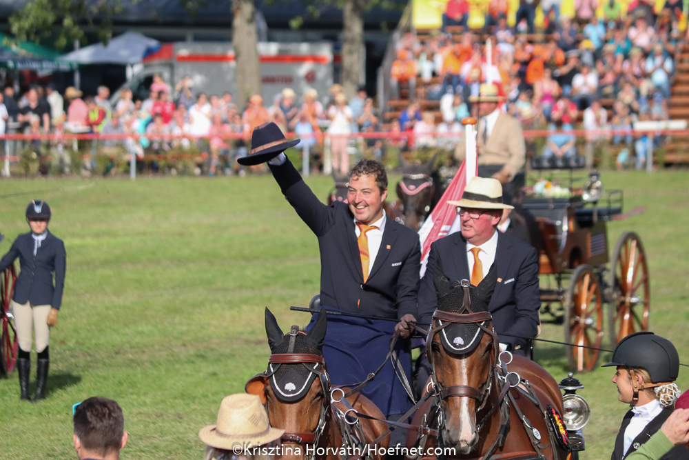 Het Hongaarse team, bestaande uit Martin Hölle, Jozsef Dobrovitz jr. en Krisztof Osztertag won voor de vierde keer op rij WK-goud. Voor het team van Aarts lag het zilver te wachten, nadat Geert Dijkhof een belangrijke bijdrage aan het teamresultaat leverde door met slecht 0,64 strafpunten uit de vaardigheid te komen. Geert Dijkhof was eerder het streepresultaat in de dressuur en de marathon, maar zijn goede vaardigheid was van groot belang. “Dat geeft zo’n man heel veel voldoening”, weet de bondscoach. “Ik had hem voor de marathon meegenomen en voor de vaardigheid, en voor de dressuur had ik op de twee anderen gehoopt. Dat kwam ook precies zo uit. De puzzel viel precies in elkaar dit kampioenschap. Vandaag bleek deze opstelling achteraf de juiste keuze. Deze zilveren medaille voelt voor ons allemaal als goud.”
