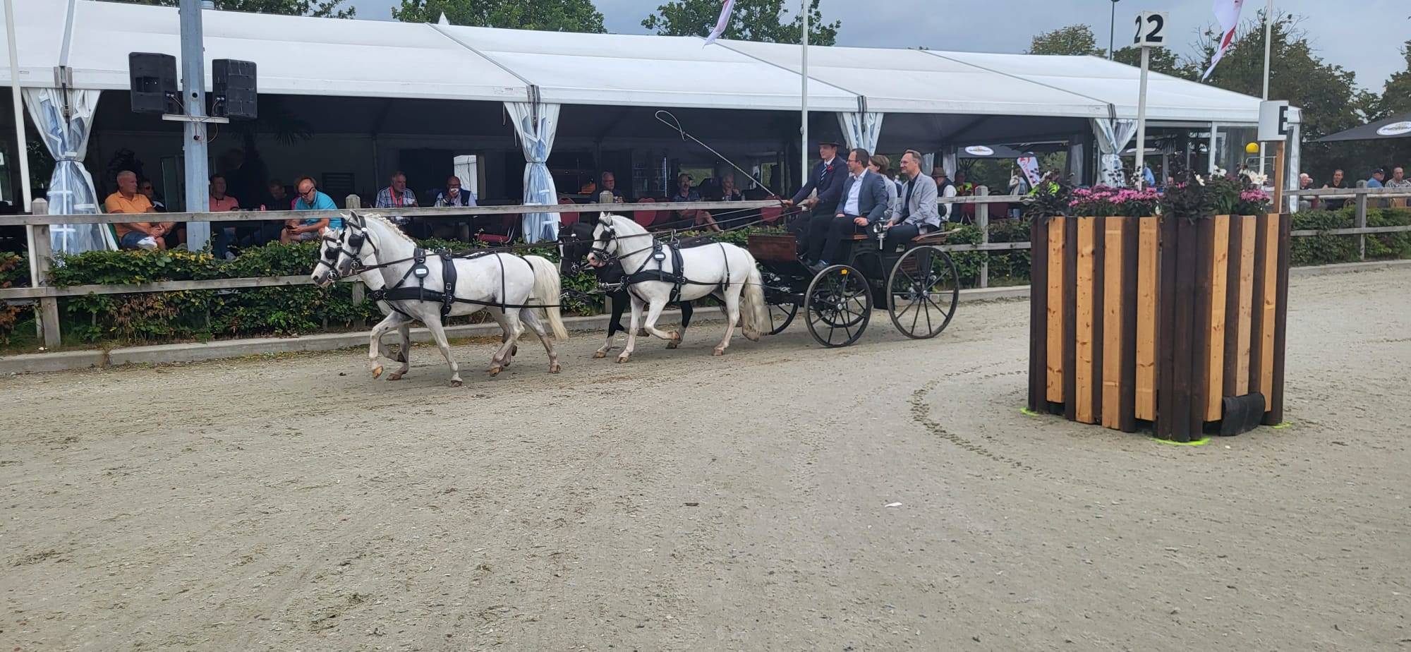 Tijdens de tweede wedstrijddag van het EK&WK mennen op het Hippisch Centrum Exloo werden Burgemeester Jan Seton, wethouder Ankie van Tongeren en wethouder Jeroen Hartsuiker in stijl binnengereden voor een bezoek aan de wedstrijd.Joris Wouda bracht met zijn ponyvierspan de drie gemeentebestuurders de piste in waar de burgemeester nog even van de gelegenheid gebruik maakte om de Nationale Sportweek en het EK wielrennen onder de aandacht te brengen. Na een rondje waarin Joris zijn pony’s nog even extra liet gaan, namen ze plaats in de VIP tent om de wedstrijd te volgen.