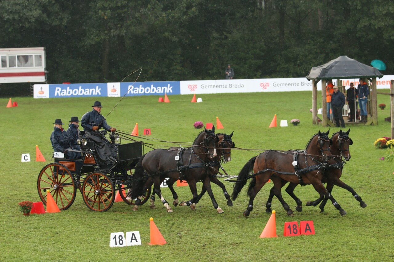 Koos de Ronde schaffte heute Vormittag die einzige fehlerfreie Runde in der erlaubten Zeit beim Hindernisfahren des CAIO Breda, der zweiten Teilprüfung des Nationenpreises der Vierspänner Pferde im Rahmen von Outdoor Brabant. De Ronde hat sich damit auf den 2. Platz in der Zwischenkombi vorgeschoben und hat nur noch den führenden IJsbrand Chardon vor sich.