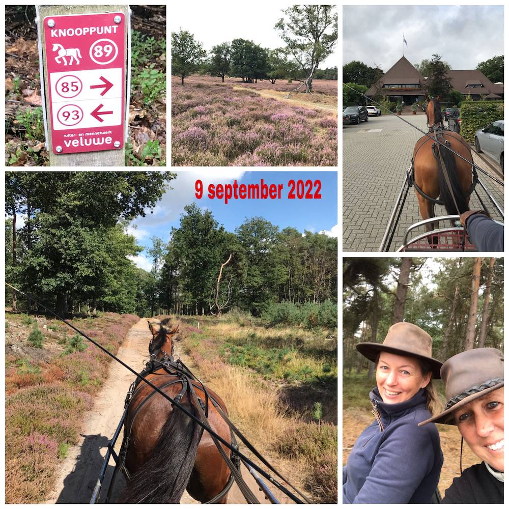 The carriage is ready, I give Billie a hug and after the traditional pocket check with Billie’s nose (‘who knows, he might manage to deserve that apple before the ride this time’) we tie our luggage on the carriage and we harness Billie. There we go. I feel like a pony club girl from back in the days. The moment we get on the carriage, it stops raining. After a few minutes of quiet walking we reach the edge of the Veluwezoom. The large wooden gate opens and a beautiful forest awaits us. The first few kilometers still feel a bit like home because we go through this gate every week to enjoy this amazing backyard. How privileged we are that this is possible … and how beautiful is The Netherlands!