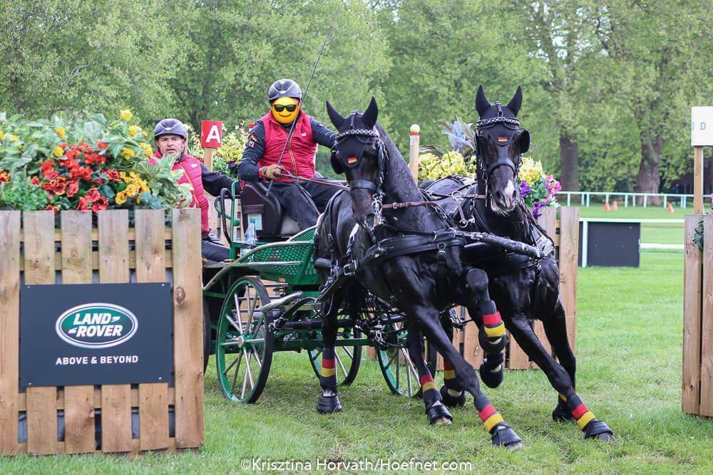 Photo nr. 2 showed team Belgium (Glenn Geerts, Edouard Simonet and his Arabo Friesians, Dries Degrieck and Chef d’equipe Mark Wentein) at the 2018 Royal Windsor Horse Show. The team finished second, after the Dutch.