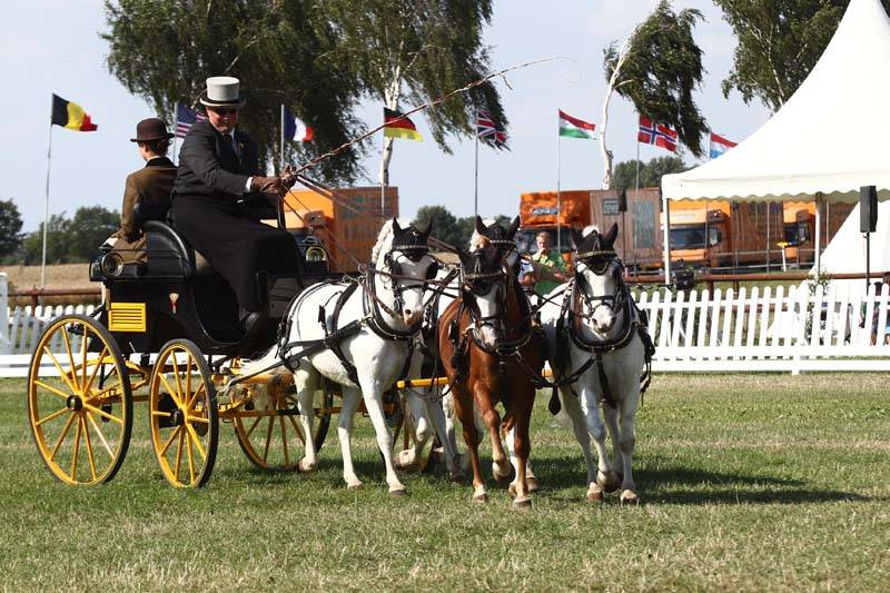 Today, the pony pairs and the pony four-in-hands entered the beautiful arena of the World Championship worthy competition Minden, Germany. German Champion Marco Freund took the lead in the pony pairs class, while Dutch former World Champion Jan de Boer set the winning score in the pony four-in-hand class.The German drivers dominated the top three in the pairs class with host Christof Weihe in second place and reigning World Champion Dieter Baackmann on the third position. Best foreign driver is Wendy O’Brien in fourth place.