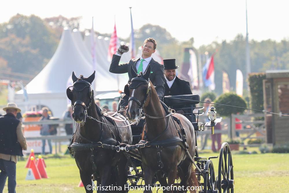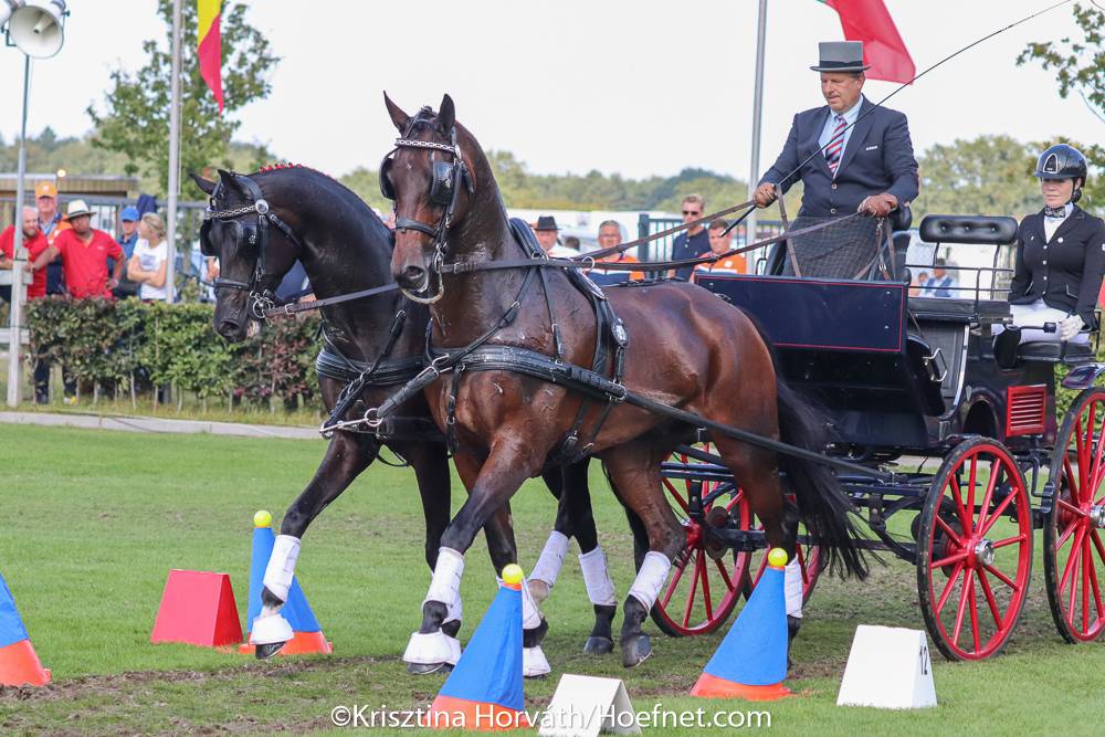 On the last day of the World Pair Driving Championships the drivers faced a selective course. The tough course that Jeroen Houterman had devised revealed who had the best obedience horses.No one managed to drive clear and within the time limit. The Hungarian Gyorgy Fekete won the final part. He drove very efficiently and was very lucky on gates 5C and D which he almost hit. Thanks to the better ‘magic work’ he managed to leave all the balls on top. He only received 0.92 penalty points for exceeding the time. This good result also counted for the Hungarian team that took the lead in the country classification after the marathon.