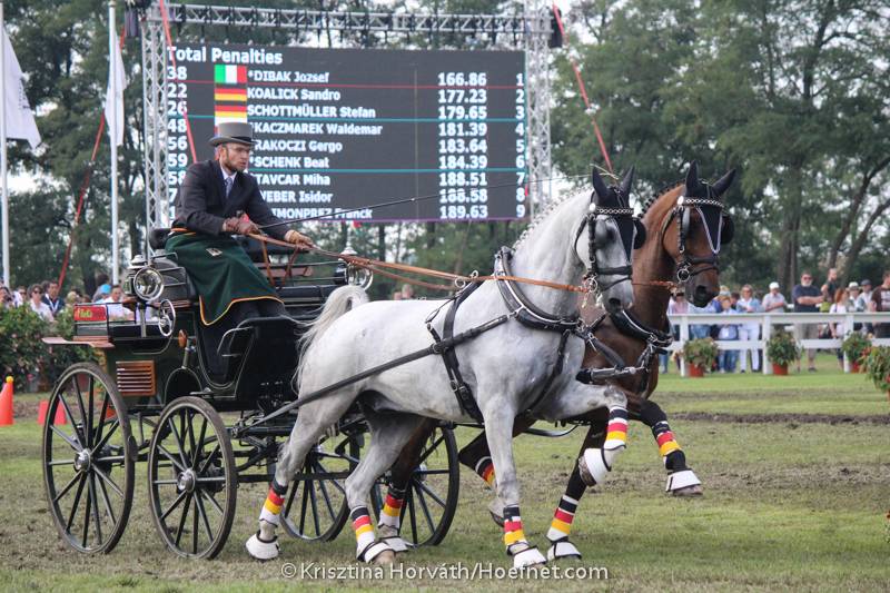 Nach Dressur, Marathon und Hindernisfahren standen insgesamt 357,4 Punkte auf dem Konto von Sebastian Warneck und seinen Teamkollegen Anna Sandmann (Lähden) und Arndt Lörcher (Wolfenbüttel). Damit war der Abstand zu den Silbermedaillengewinnern aus Italien doch recht groß (340,3) und noch größer zu den dominierenden Ungarn (322,5). Das Gastgeberland stellte auch in der Einzelwertung die Besten: Vilmos Lazar gewann Gold, der jüngere Zoltan Lazar Silber. Bronze ging an Joszef Dibak aus Italien. Hinter einem weiteren Ungarn, Joszef Dobrovitz jun., belegte Sebastian Warneck Platz fünf. Auf Platz sieben folgt Einzelfahrer Sandro Koalick. Der 31-jährige aus dem brandenburgischen Drebkau war zum ersten Mal bei einer WM dabei, belegte in der Dressur Platz acht und hatte vor allem gestern als Dritter der Marathonfahrt geglänzt. Auch der 37-jährige Stefan Schottmüller aus Kraichtal in Baden-Württemberg fuhr eine starke WM und war mit Platz sechs bester Deutscher im Hindernisfahren – Platz acht sein Endergebnis in der Einzelwertung. Auf Rang 15 folgte die erst 19-jährige Anna Sandmann, Arndt Lörcher wurde 28. Dazwischen schob sich eine weitere WM-Debütantin: Kathrin Scheiter aus Leidersbach (Rang 19).