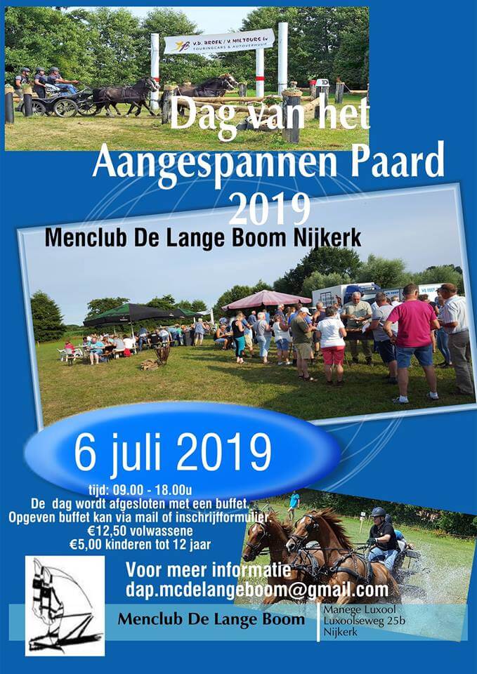 Op de anders zo stille paadjes in de buitengebieden van Nijkerk was het zaterdag 6 juli gezellig druk met aanspanningen en fietsers tijdens de Dag van het Aangespannen Paard.Het evenement met als thema ‘Flora en Fauna’ bestond uit een hindernissen- en opdrachtentraject, waarin onderweg letters te vinden waren die het woord ‘paardenluisvlieg’ vormden. Onder heerlijke weersomstandigheden vermaakten de deelnemers en publiek zich uitstekend in de hindernissen en spelelementen rond de terreinen van Manege Luxool en de familie Bethlehem.