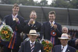 IJsbrand Chardon, Koos de Ronde en Mark Weusthof waren als team de hele wereldtop te sterk af. Daarmee voldeden de mannen aan de plannen van bondscoach Tjeerd Velstra die voor twee keer goud naar Landgoed Marienwaerdt in Beesd kwam.