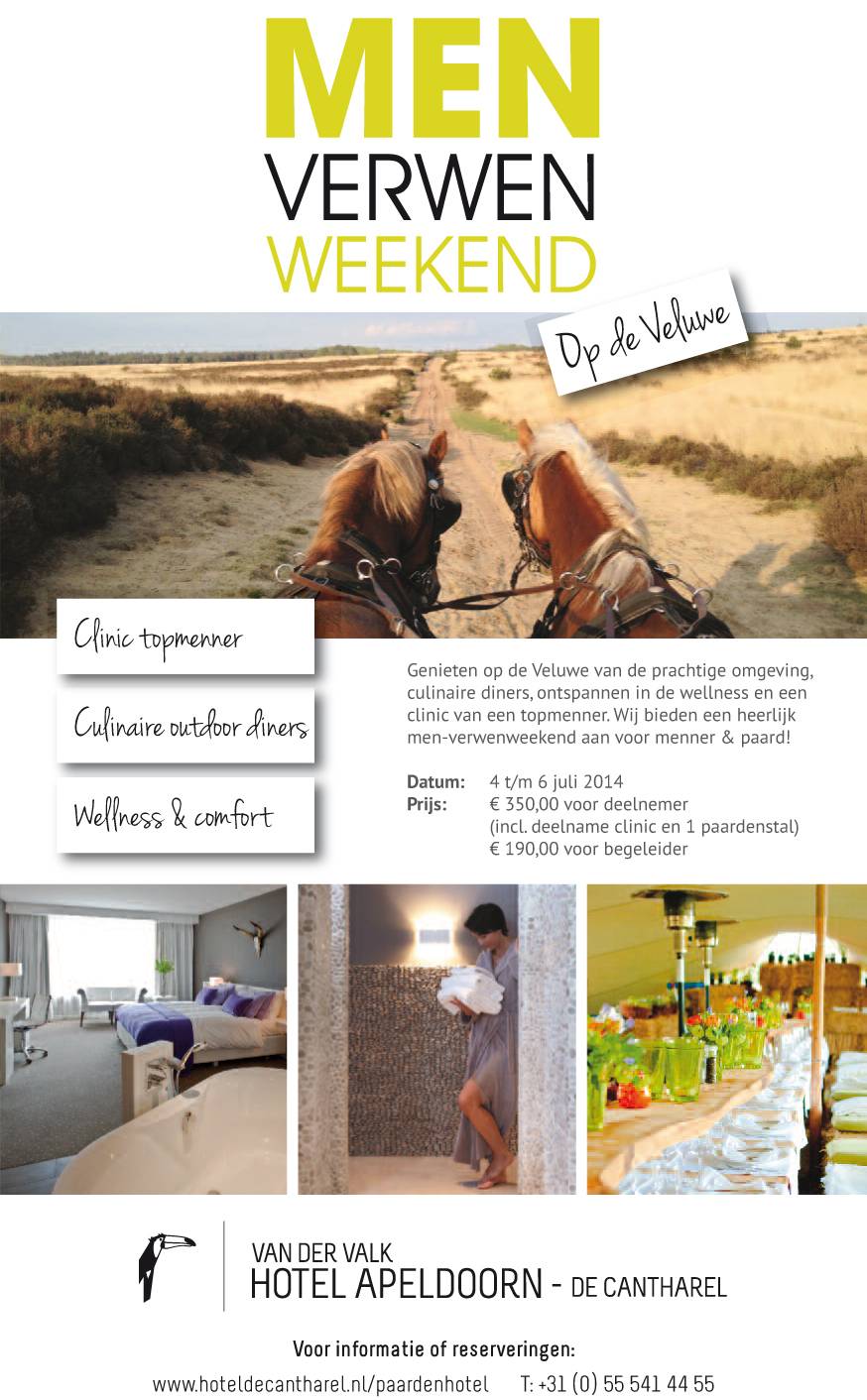 Genieten op de Veluwe van de prachtige omgeving, culinaire diners, ontspannen wellness en een clinic van topmenners? Dit aantrekkelijke totaalplaatje voor menners, grooms en paarden wordt u van vrijdag 4 tot en met zondag 6 juli aangeboden door Hotel de Cantharel in Ugchelen. Deze locatie aan de rand van uitgestrekte glooiende bossen en hei leent zich uitstekend voor dit verwen-menweekend.