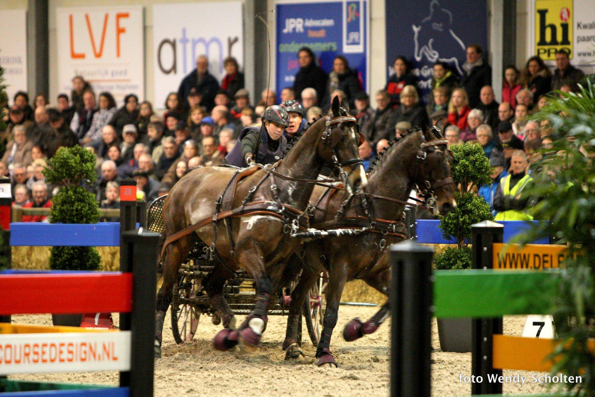 Na de eerste omloop werd al snel duidelijk dat het lastig zou worden om de Martin Hölle te verslaan. De 18-jarige zilveren medaillewinnaar van het WK enkelspan pony’s 2015 maakt dit jaar de overstap naar de tweespan paarden en rijdt momenteel met enige regelmaat indoor wedstrijden om de kunst van het tweespan rijden onder de knie te krijgen. En dat was te zien, want Hölle stuurde zijn span Lipizzaners vlot en behendig zonder enige hapering door het parcours. Hölle zette in beide omlopen de snelste tijden neer en het afgeworpen balletje in de tweede omloop bracht zijn overwinning niet in gevaar: “Het was super om hier te rijden,” vertelt Martin. “De sfeer is geweldig, dit kennen we in Hongarije niet. Het was echt overweldigend toen ik de eerste keer de ring in kwam.”