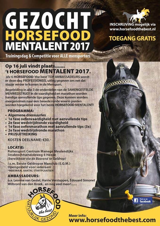 Deze trainingsdag wordt georganiseerd door Horsefood the Best in samenwerking met de Eerste Geldropse Menclub. De kosten voor deelname aan deze leerzame dag zijn 30 euro per aanspanning.