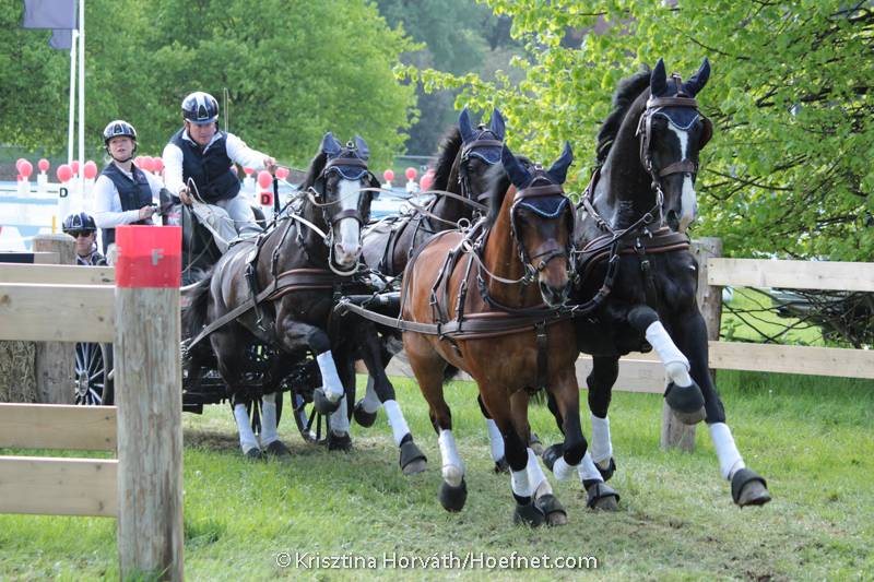 Hűvös, de napsütéses időben zajlott a mai maratonhajtás Windsor-ban. 28 négyesfogat és 10 póni négyesfogat teljesítette a Richard Nicoll által tervezett nyolc akadályt.