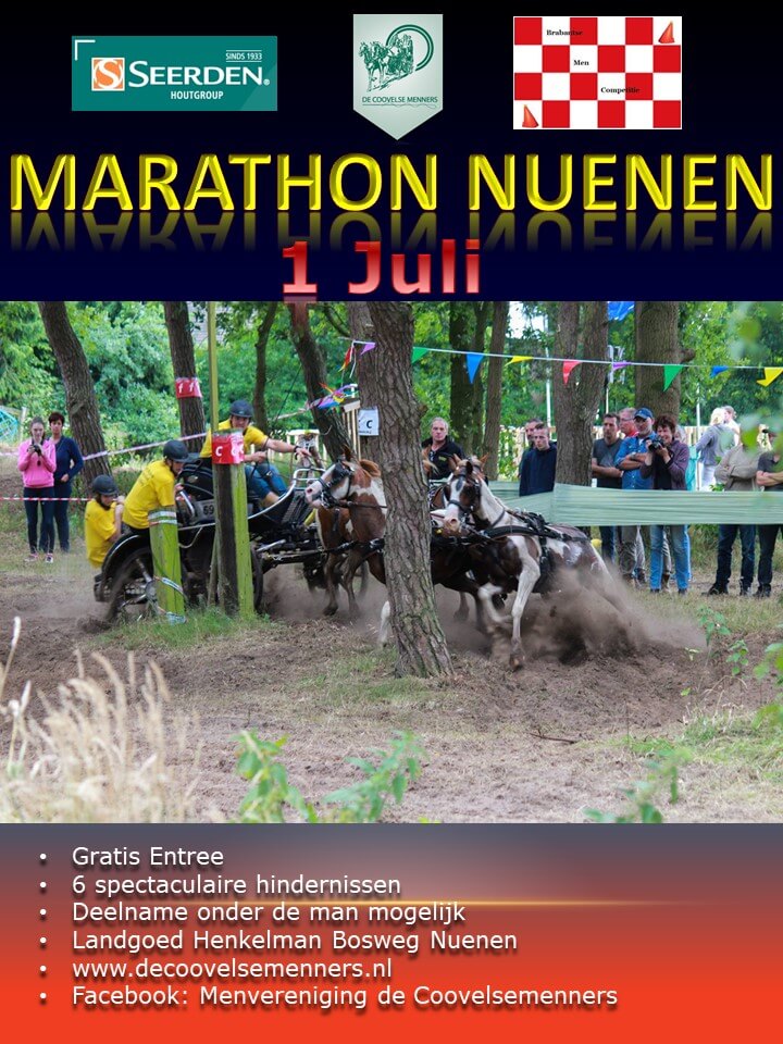 Zondag 1 Juli organiseert De Coovelse Menners uit Nuenen de jaarlijkse oefenmarathon. De wedstrijd is aangemeld als impulswedstrijd, telt mee voor de Brabantse Men Competitie en er kan door iedereen deelgenomen worden.Deze wedstrijd bestaat uit een vaardigheid, een A-traject en zes spectaculaire hindernissen voor menners en toeschouwers waarvan vier boshindernissen.