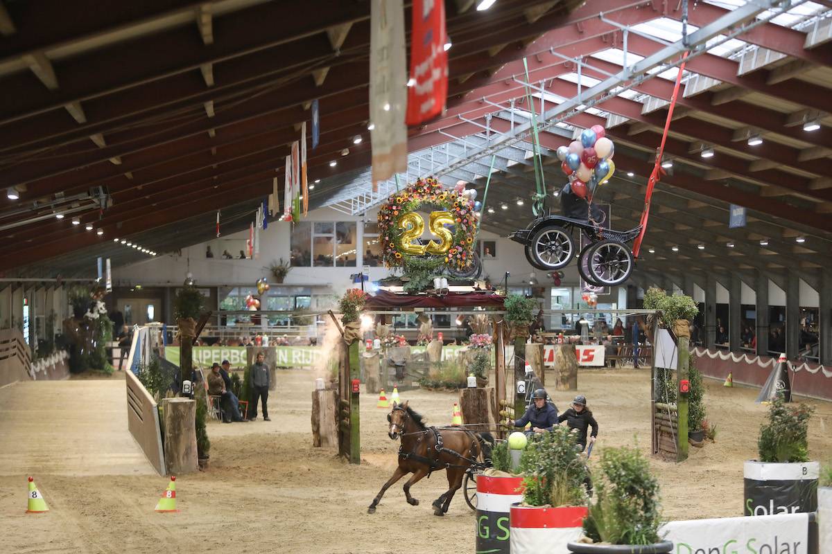 Vandaag rijden overdag de tandems, vierspan pony’s en tweespan paarden hun voorrondes. De spectaculaire finale begint vanavond om 19.00 uur. Naast de finale rubrieken is er ter gelegenheid van het jubileum ook een quadrace voor grooms.