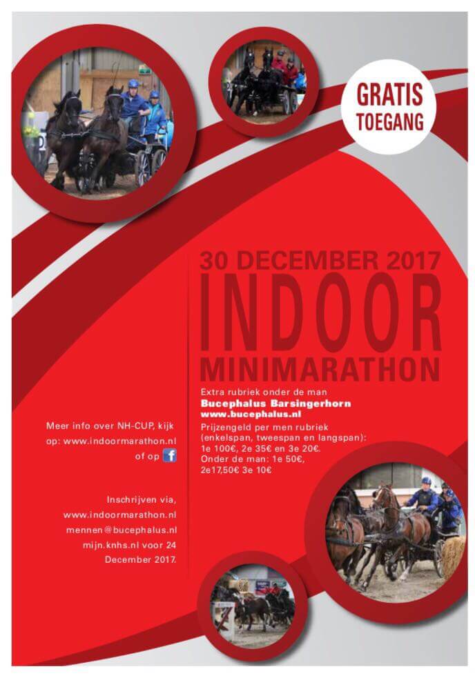 Op zaterdag 30 december organiseert Paardensportvereniging Bucephalus in Barsingerhorn een indoormarathon voor menners en ruiters.De vernieuwde wedstrijdorganisatie werkt aan een nieuw concept voor de wedstrijd met spectaculaire hindernissen in een snel parcours, en een finaleronde voor de deelnemende menners.