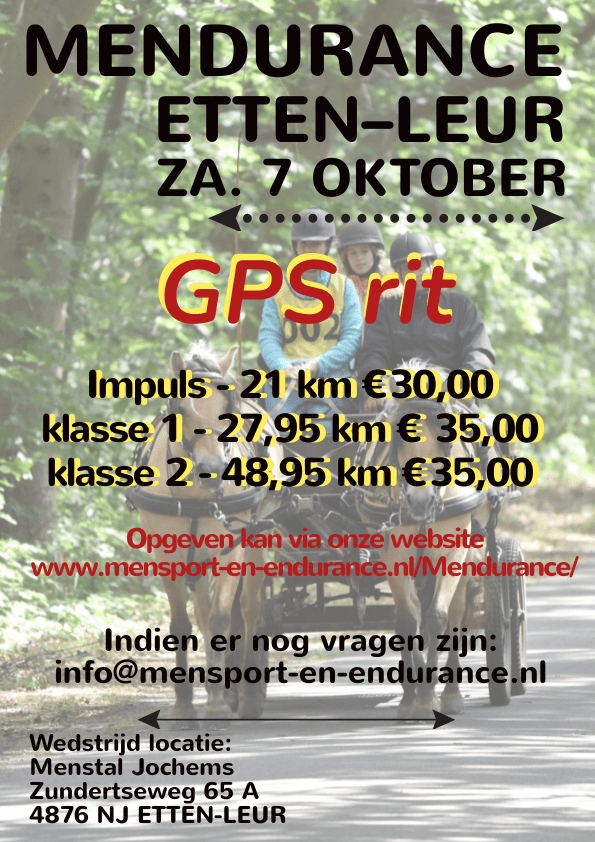 Op zaterdag 7 oktober organiseert Stichting Mensport en Endurance Etten Leur een Mendurance wedstrijd voor klasse impuls 21 km, klasse 1 (28 km) en klasse 2 (49 km). De route wordt op GPS gereden en inschrijven is nog mogelijk.Het is dus mogelijk om mee te doen aan de Mendurance door middel van GPS, maar als gewenst kunnen deelnemers ook een routebeschrijving krijgen.