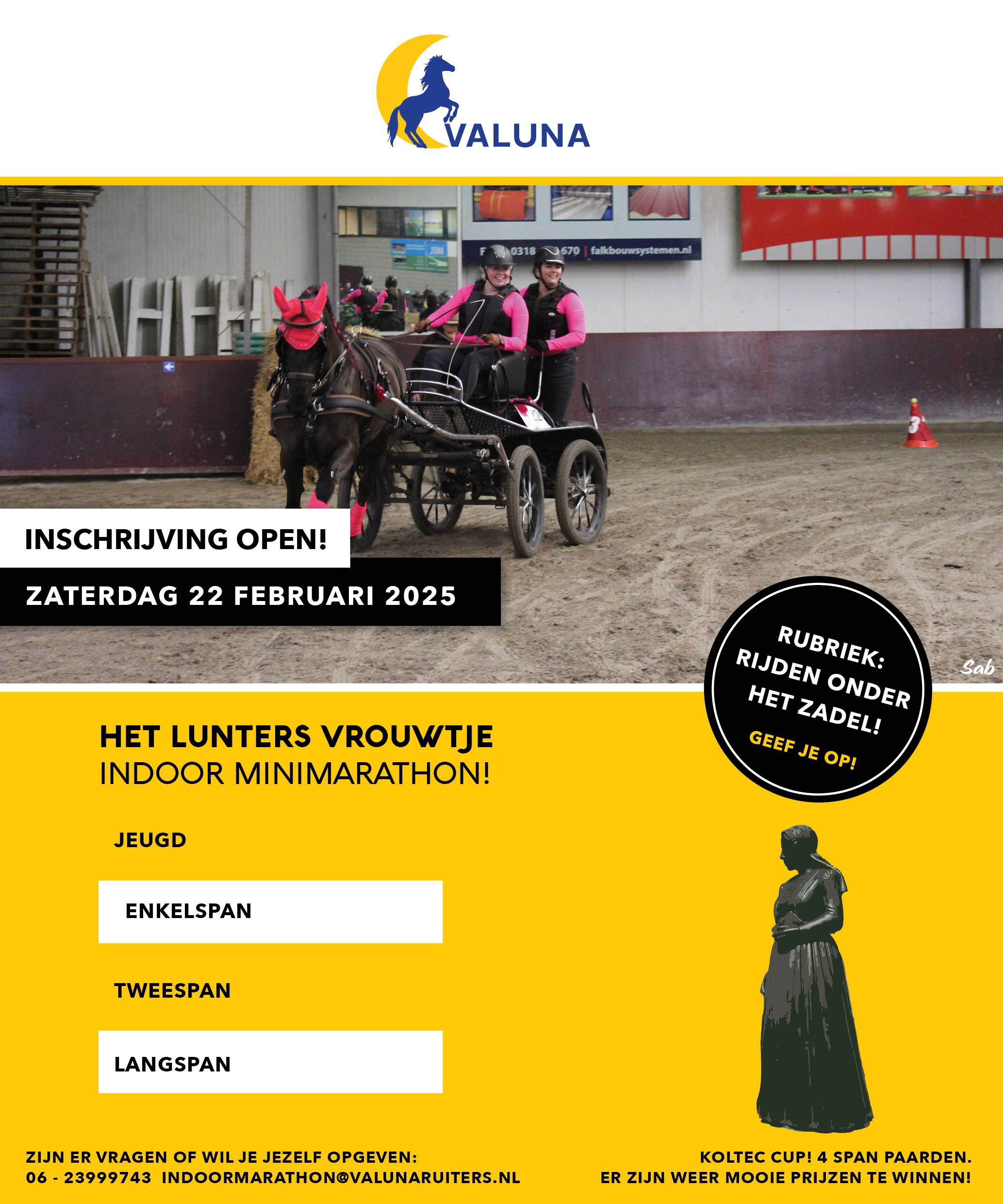 Op 22 februari organiseren de Lunaruiters hun indoor minimarathon in Lunteren. De inschrijving is geopend.Sinds vorig jaar wordt er een wisselbeker van Het Lunters Vrouwtje uitgereikt aan de best presterende combinatie over twee wedstrijden: de indoor minimarathon in Lunteren én de outdoor minimarathon tijdens het CH Hoekelum in Bennekom. Om mee te doen in de strijd om de wisselbeker die (vorig jaar gewonnen door Lidewij Gelderblom), moet je dus aan beide wedstrijden deelnemen.