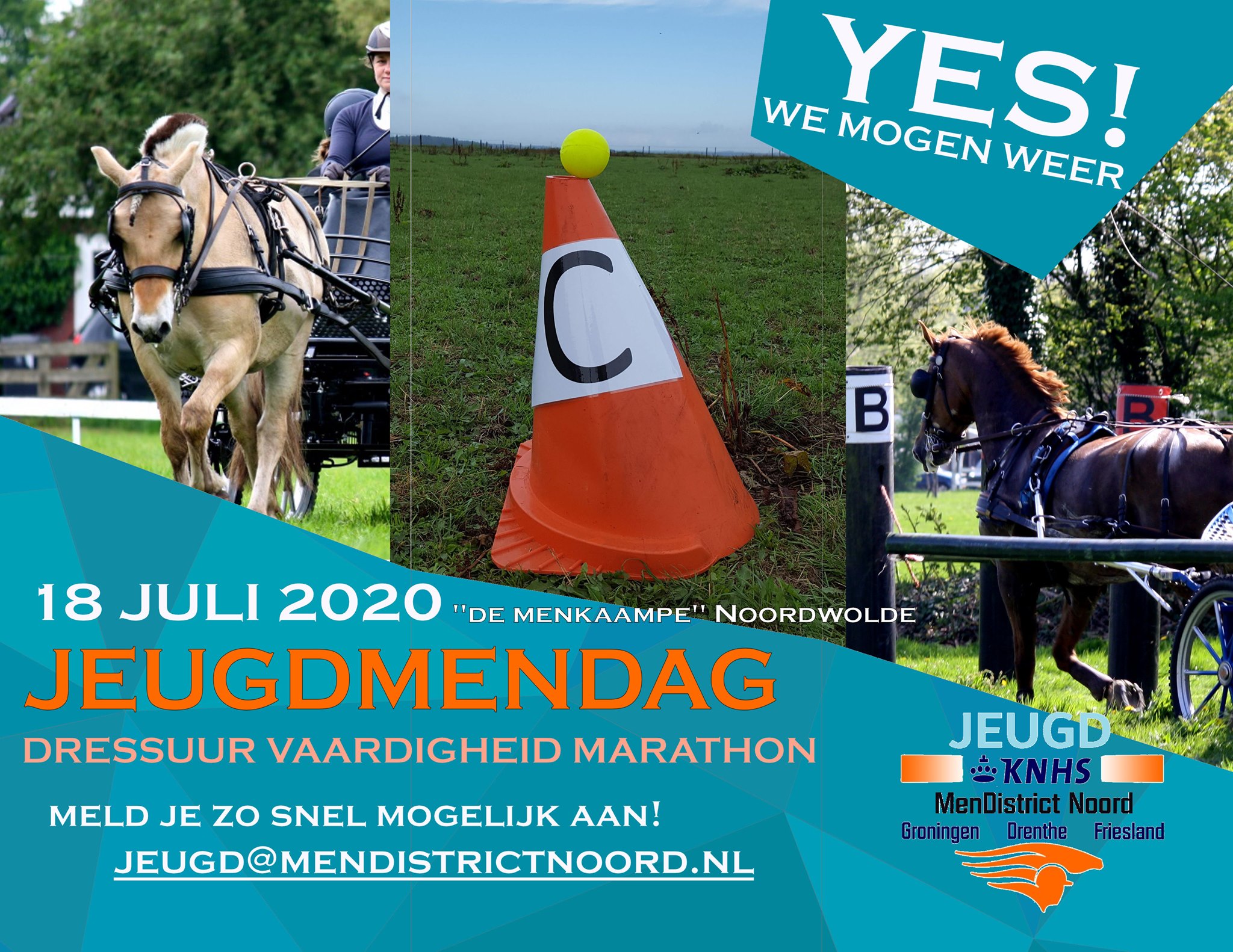 Op 18 juli werd door Mendistrict Noord de eerste Jeugdmendag van 2020 georganiseerd voor 23 deelnemers op "De Menkaampe", het terrein van Menvereniging Noordwolde.De dagstart begon met een half uur dressuurles, gegeven door Marjet Westerhoff. In de dressuurbaan had zij met kleurige hoedjes verschillende lijnen en figuren uitgezet, waardoor het voor alle leeftijden een uitdagende les werd.