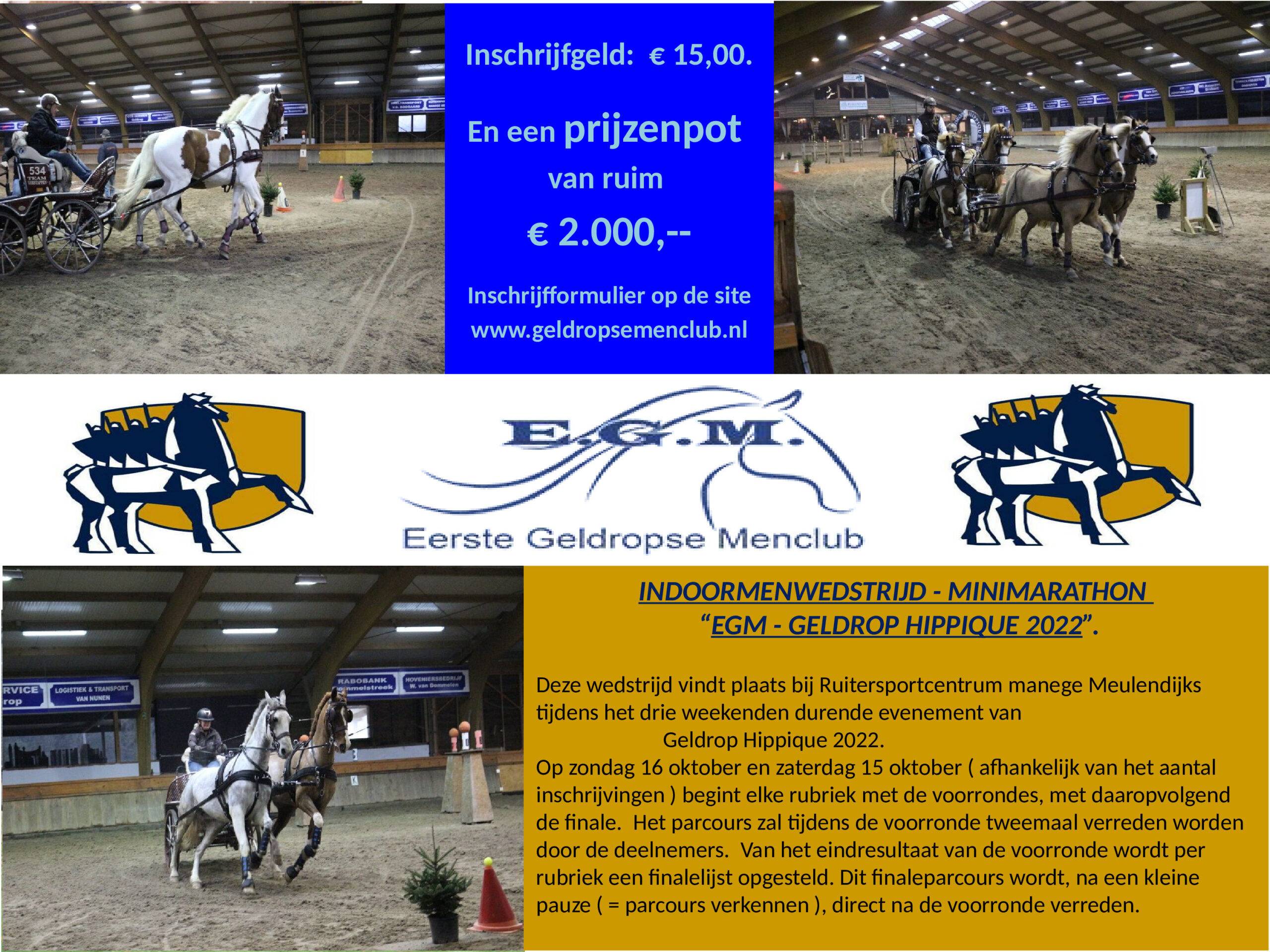 In het weekend van 15 en 16 oktober organiseert de Eerste Geldropse Menclub de jaarlijkse minimarathon in het kader van Geldrop Hippique. Het evenement bestaat veertig jaar en heeft daarmee een jubileum te vieren.De wedstrijd wordt op 16 oktober verreden in de hal van Manege Meulendijks, maar wanneer net als voorgaande jaren veel deelnemers zijn, wordt er ook op 15 oktober gereden en gestreden.