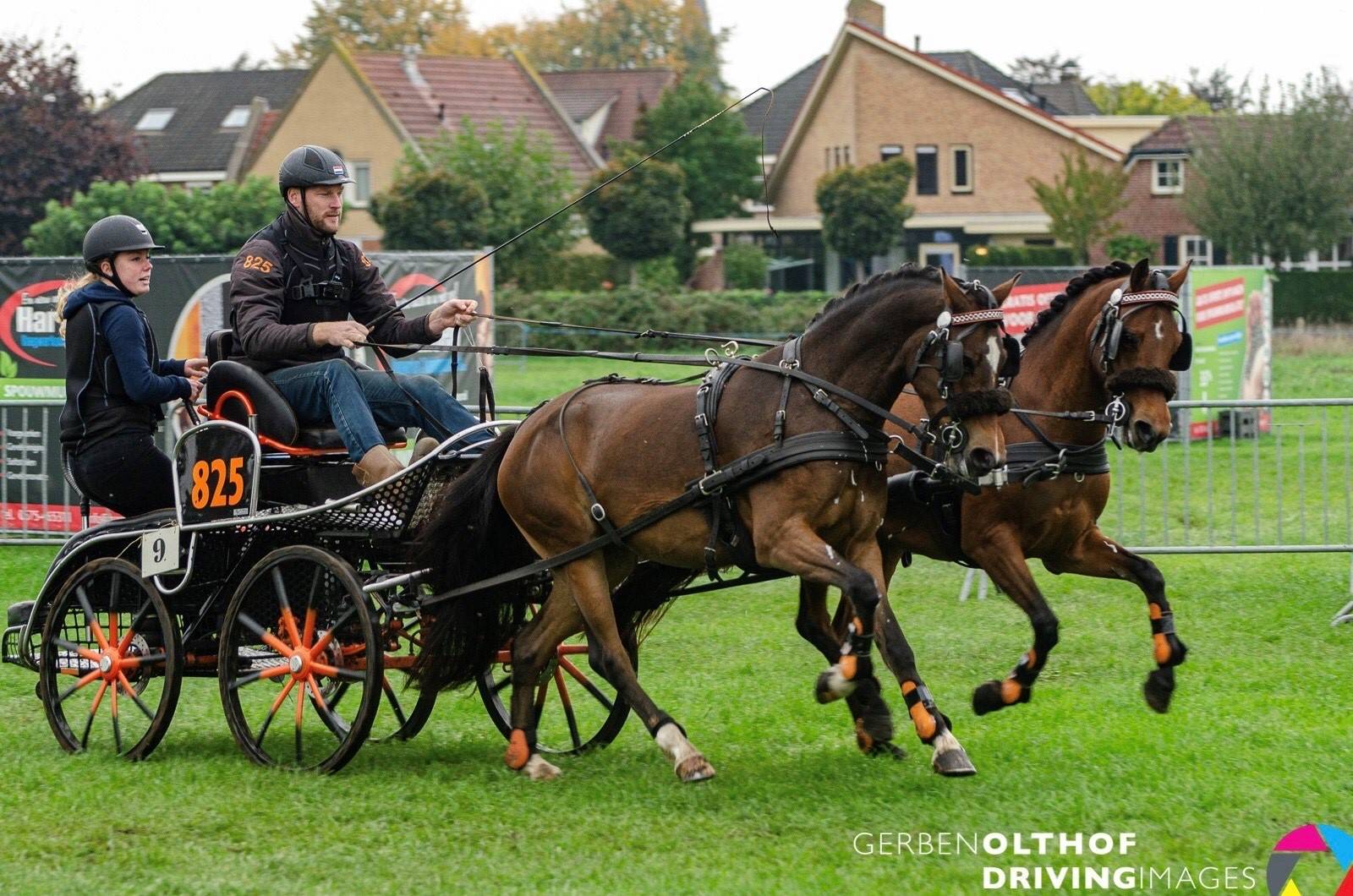 ‘Ik ben ongeveer 10 jaar geleden begonnen met paardrijden bij de familie Stronks. Zij reden ook altijd al aangespannen en zo hebben zij mij ook besmet met het menvirus. Daarnaast ben ik via hen bij Mark Weusthof terecht gekomen. Met hem en zijn team ben ik al een paar seizoenen mee geweest op de internationale wedstrijden. Van deze ervaringen heb ik al heel veel geleerd, voornamelijk met betrekking tot de voorbereiding op de drie verschillende onderdelen. Als ze mij nou de vraag zouden stellen wat ik het liefst doe, het onder het zadel rijden of aangespannen, zou ik niet kunnen kiezen. Ik vind het juist mooi om deze disciplines te combineren om zo de pony’s zo allround en optimaal mogelijk te trainen en te gebruiken.’