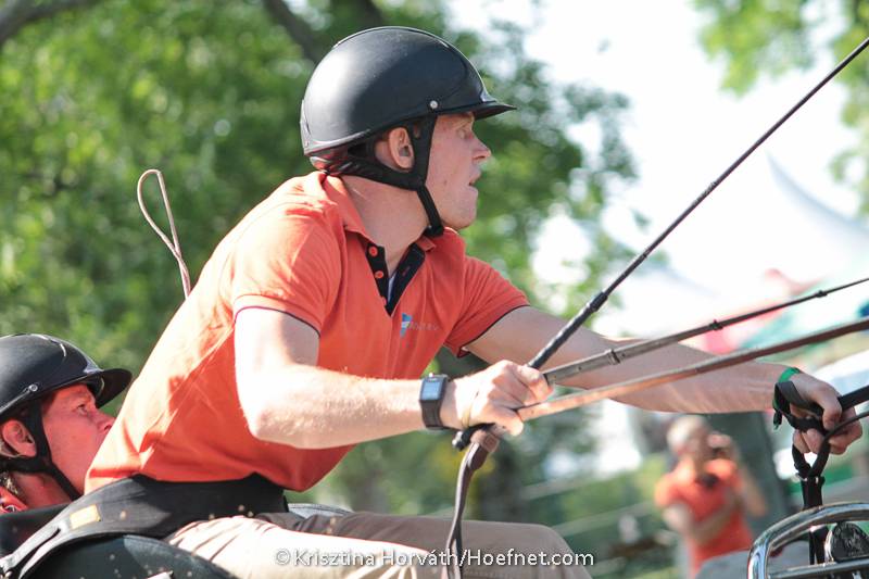 Bij de vierspannen reed József Dobrovitz een gedegen marathon waarin hij in zes van de zeven hindernissen top-drie tijden liet noteren. Dobrovitz is hiermee zijn zoon voorbij gestreefd in het tussenklassement, maar het verschil tussen beide topmenners bedraagt slechts 0,72 strafpunten dus ook hier wordt het een spannende strijd in de vaardigheid morgen. Dressuurwinnaar Jiri Nesvacil bezet de derde plaats, op minimaal verschil gevolgd door István Váczi.