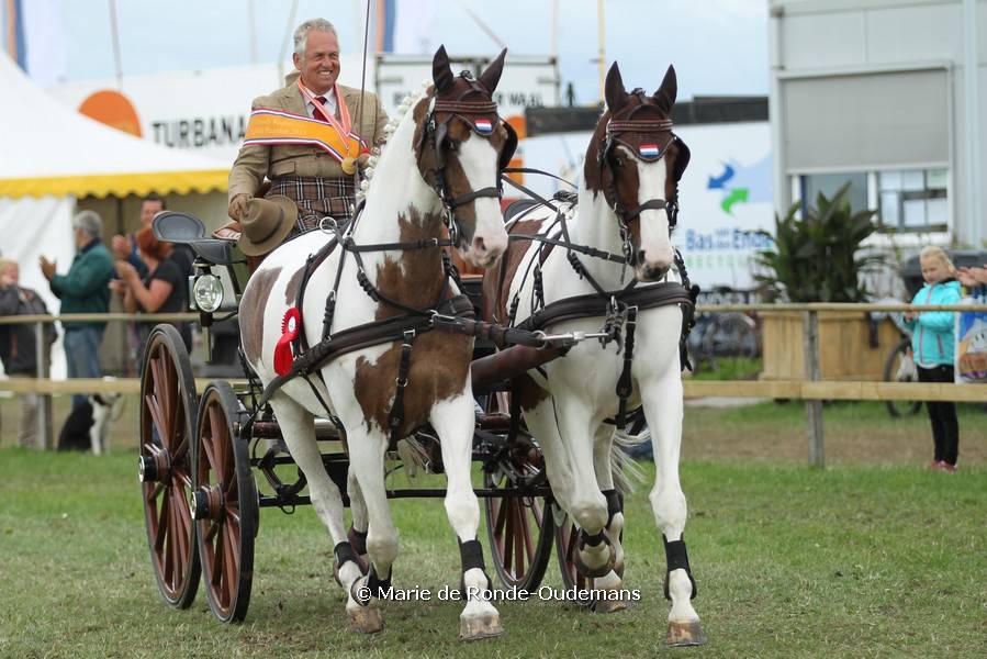De afsluitende vaardigheidsproef zorgde vanmiddag voor een spannende ontknoping in de finale van het NK tweespannen. Harrie Verstappen liet enkele tijdfouten noteren en wist zodoende zijn vierde nationale gouden medaille zeker te stellen. De algemene eindoverwinning ging naar Riant-menner Claudio Fumagalli die als enige de lei volledig schoon wist te houden.Met name de toegestane tijd bleek een behoorlijke scherprechter te zijn en zorgde voor teleurstelling én blijdschap. Na de dressuur en de marathon stonden Raymond Letteboer en Antonie ter Harmsel op zilver en brons, maar zij wisten deze posities niet vast te houden. De ervaren vaardigheidsspecialist Carlo Vermeulen tikte één balletje van de kegels en passeerde iets over de toegestane tijd de finish. Met dit uitstekende resultaat klom hij uiteindelijk van de vijfde plaats in het NK naar verdiend zilver. Erik Couwenberg stond op de vierde plaats in het NK-klassement en wist evenals Ben Gosschalk foutloos te blijven. Nadat Letteboer en ter Harmsel met de nodige strafpunten de ring hadden verlaten, klom Couwenberg hiermee op naar brons in het NK. Tristan Verheijen wist nog twee plaatsen te klimmen en eindigde net naast het podium op de vierde plaats, voor Letteboer, Gosschalk en Ter Harmsel.