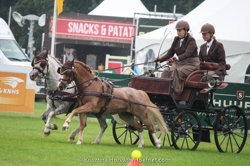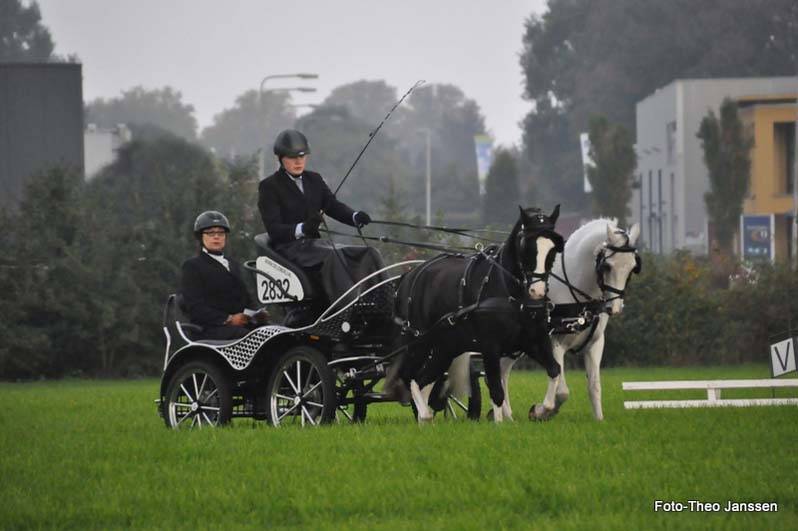 Twee leden van de KNHS Audevard Next Driving Generation, Melanie van de Bunt (Ede) en Jurgen Bolt (Wijhe), komen met hun aanspanning in de baan.