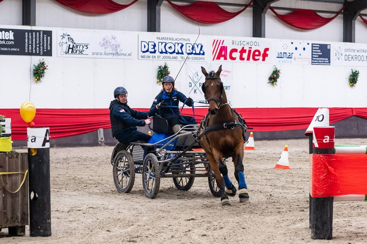 De Zeeuwsche Menvereniging organiseerde afgelopen vrijdag en zaterdag hun eerste indoor marathon van het seizoen 2023-2024. Er was veel belangstelling om in de mooie accommodatie in Nieuw en Sint Joosland deel te nemen aan de wedstrijd. In totaal kwamen er zo´n 90 deelnemers uit Nederland, België en Frankrijk aan de start. Er waren veel ervaren aanspanningen, maar er was ook ruimte voor nieuwe deelnemers en minder ervaren paarden en pony's.De wedstrijd ging vrijdag om 16.30 uur van start met de eerste voorrondes. Dat ging zaterdag tijdens het dagprogramma verder. De besten kwamen op zaterdagavond opnieuw aan start in de finales waar de prijzen werden verdeeld. Maar voor de jeugdmenners waren de eerste omlopen gelijk beslissend voor de eindrangschikking. De strijd tussen de vijf aanspanningen was spannend, want de nummers 1 en 2 eindigden binnen één seconde van elkaar. Noéemie Ghesquiere was net een fractie sneller dan Hannelore Timmerman en won.
