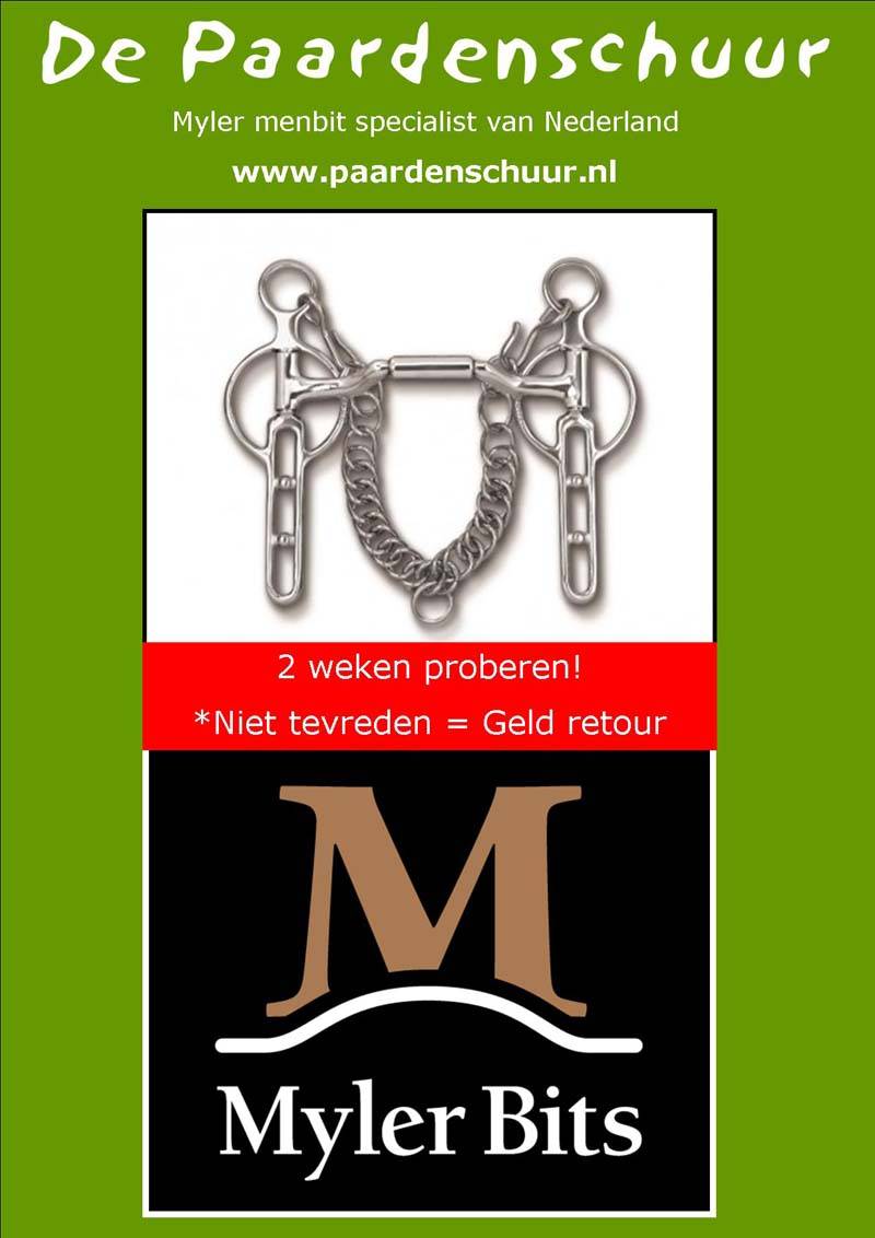 De Paardenschuur Ruitersport is gespecialiseerd in Myler menbitten en biedt een speciale service. Als het Myler menbit niet aan uw verwachtingen voldoet, kunt u het bit namelijk binnen twee weken retourneren of omruilen.Myler menbitten zijn ontworpen volgens een specifiek systeem, waarbij de anatomische vorm van de paardenmond de basis vormt. Dit heeft geleid tot een ontwerp van een gewelfd en gebogen mondstuk dat het paard vrijheid geeft voor zijn tong waardoor speekselvorming wordt gestimuleerd. De onafhankelijke zijdelingse beweging geeft de menner de gelegenheid om eenzijdig in te werken en schoudervrijheid te vragen.