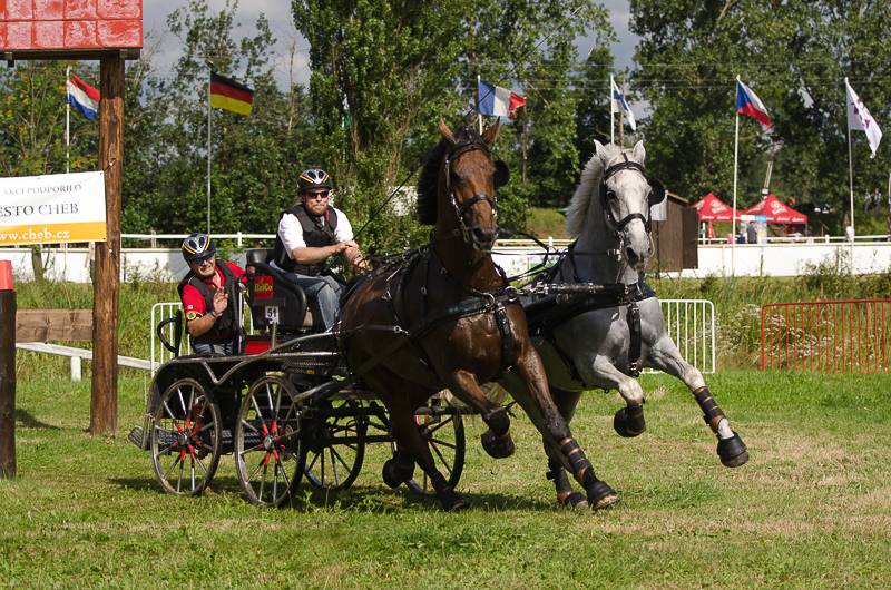 Die deutschen Zweispännerfahrer ließen ebenfalls nichts anbrennen und belegten in ihrem Wettbewerb auf Drei-Sterne-Niveau die Plätze eins bis fünf. Den Gesamtsieg holte sich Sebastian Warneck (Potsdam) mit 156,62 Punkten vor Lars Schwitte (Südlohn-Oeding) mit 156,85 Punkten. Auf Platz drei folgte Stefan Schottmüller (Kraichtal/158,43), Sandro Koalick (Drebkau) wurde Vierter (160,61), Arndt Lörcher (Wolfenbüttel-Fümmelse) Fünfter (164,62). Warneck belegte mit seinem zweiten Gespann zudem Platz sieben, Anna Sandmann (Lähden) wurde Achte im 29-köpfigen Teilnehmerfeld aus neun Nationen. Die Konkurrenz der Pony-Zweispännerfahrer (CAI3*) gewann Birgit Spalt aus dem hessischen Bickenbach. FN/Birgit Springmann