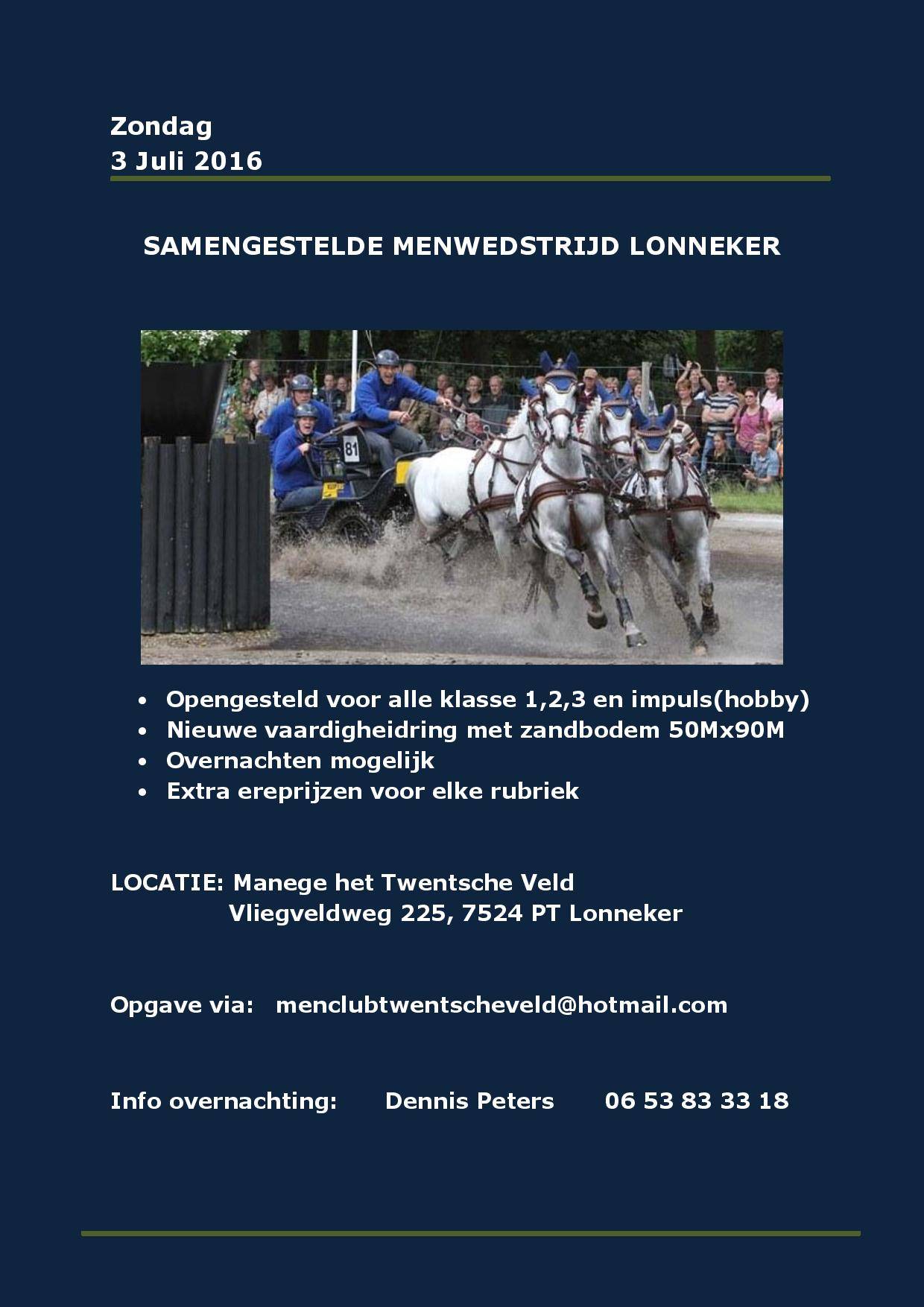 Op zondag 3 juli wordt de jaarlijkse samengestelde menwedstrijd in Lonneker verreden. De wedstrijd is zoals elk jaar opengesteld voor klasse 1 tot en met 3 en heeft daarnaast een jeugdrubriek.